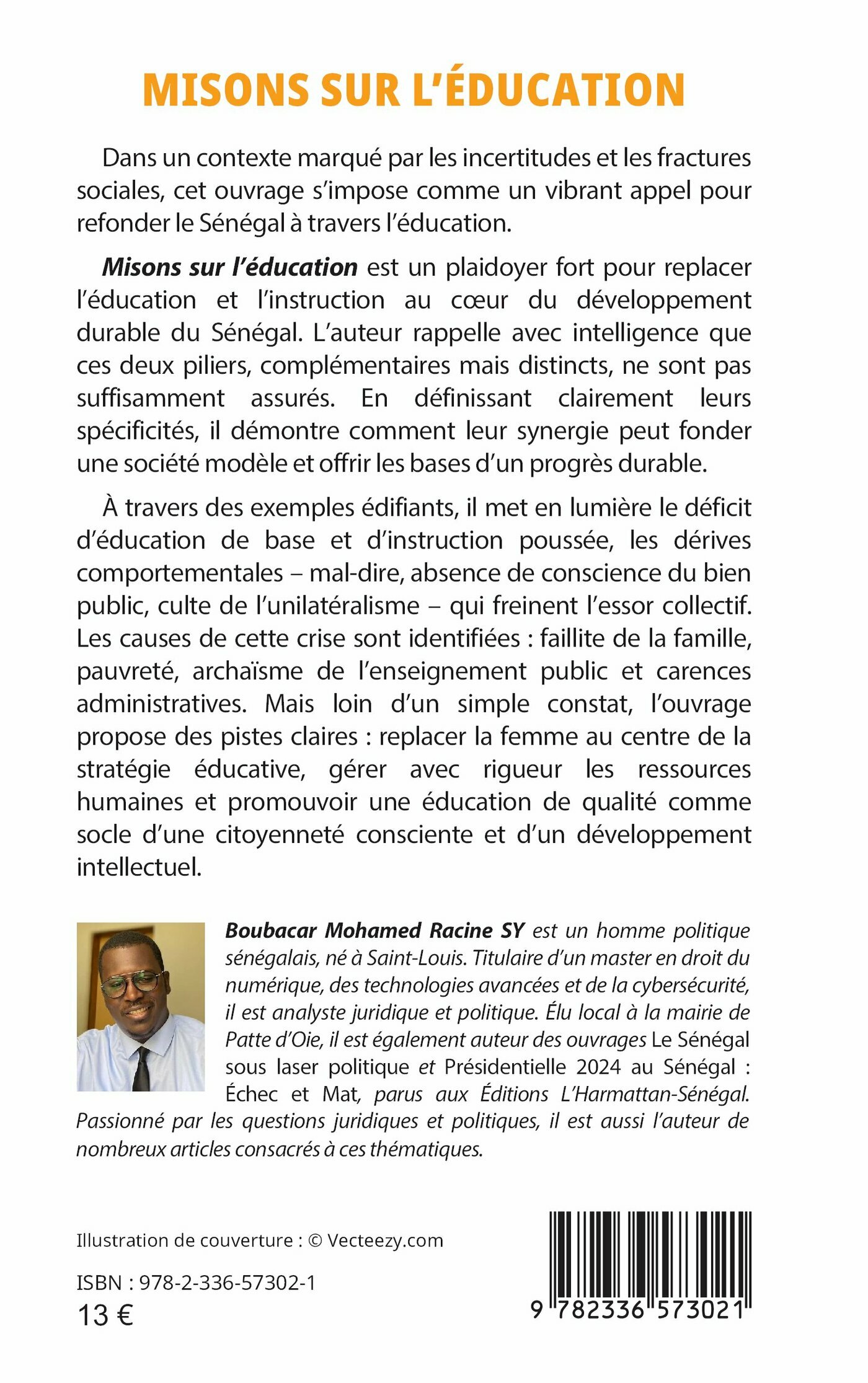 Misons sur l’éducation est un plaidoyer fort pour replacer l’éducation et l’instruction au cœur du développement durable du Sénégal. L’auteur rappelle avec intelligence que ces deux piliers, complémentaires mais distincts, ne sont pas suffisamment assurés. En définissant clairement leurs spécificités, il démontre comment leur synergie peut fonder une société modèle et offrir les bases d’un progrès durable. À travers des exemples édifiants, il met en lumière le déficit d’éducation de base et d’instruction poussée, les dérives comportementales – mal-dire, absence de conscience du bien public, culte de l’unilatéralisme – qui freinent l’essor collectif. Les causes de cette crise sont identifiées : faillite de la famille, pauvreté, archaïsme de l’enseignement public et carences administratives. Mais loin d’un simple constat, l’ouvrage propose des pistes claires : replacer la femme au centre de la stratégie éducative, gérer avec rigueur les ressources humaines et promouvoir une éducation de qualité comme socle d’une citoyenneté consciente et d’un développement intellectuel.