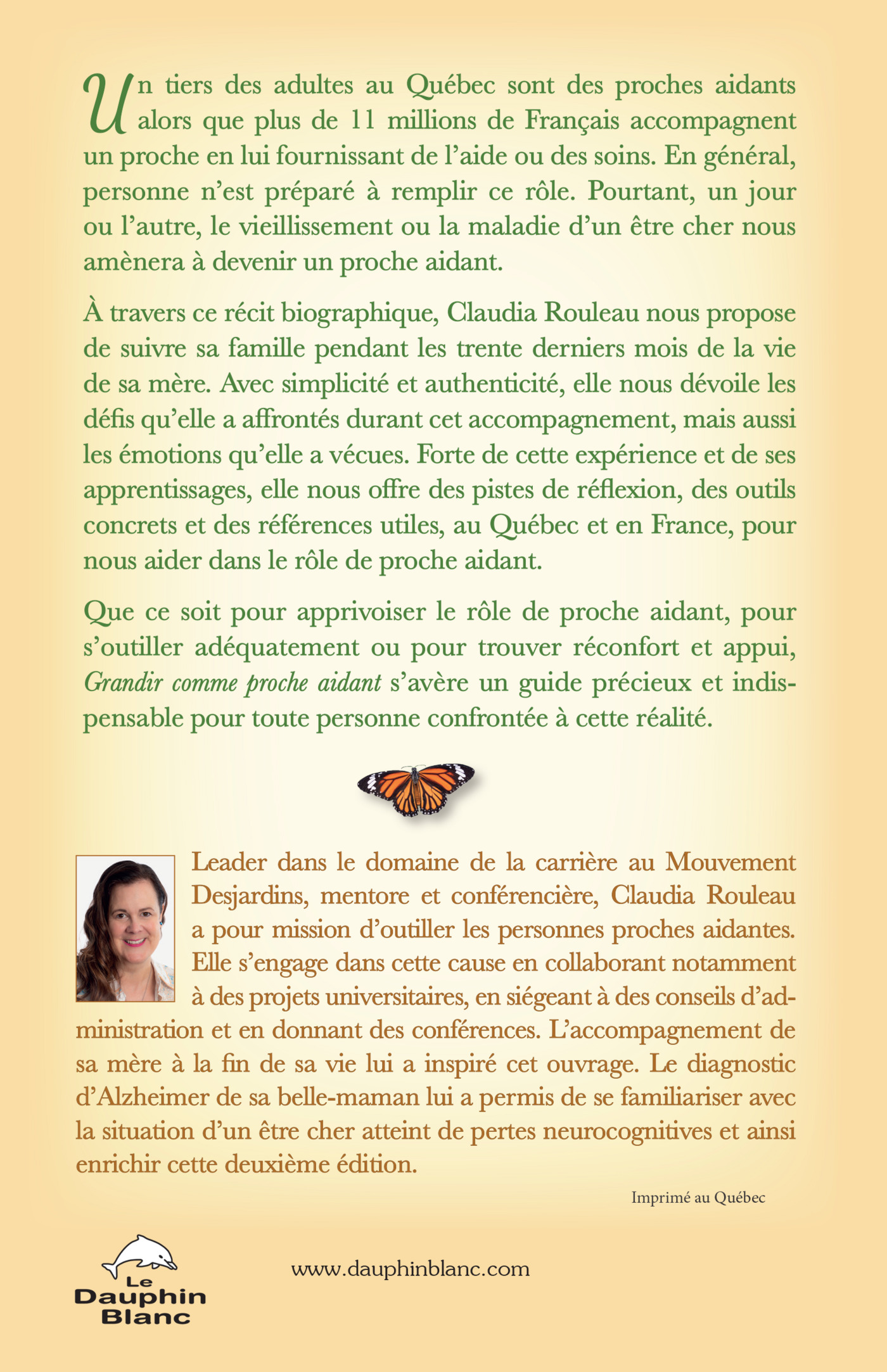 Selon une enquête sur la proche aidance au Québec en 2022, réalisée par l’Appui, un tiers des adultes sont des proches aidants. Ce sont donc 2,4 millions de Québécois qui accompagnent un de leurs proches en lui fournissant de l’aide ou des soins. Et le vieillissement de la population semble accélérer l’augmentation de proches aidants. Cependant, en général, personne n’est préparé à remplir ce rôle. Pourtant, un jour ou l’autre, le vieillissement ou la maladie d’un être cher nous affectera et nous amèneront à devenir proches aidants. À travers ce récit biographique, Claudia Rouleau nous propose de suivre sa famille pendant les trente derniers mois de la vie de sa mère. Avec simplicité et authenticité, elle nous dévoile les écueils et les défis qu’elle a affrontés durant cet accompagnement, mais aussi les émotions qu’elle a vécues. Forte de cette expérience et de ses apprentissages, elle nous offre des pistes de réflexion, des outils concrets et des références utiles pour nous aider dans notre rôle de proche aidant. Que ce soit pour apprivoiser le rôle de proche aidant, pour s’outiller adéquatement ou pour trouver réconfort et appui, «Grandir comme proche aidant» s’avère un guide précieux et indispensable pour toute personne confrontée à cette réalité.L'auteure :Leader dans le domaine de la carrière, mentore et conférencière, Claudia Rouleau est bachelière en finance et détentrice d’un certificat en orientation de l’Université Laval. C’est à 40 ans qu’elle choisit de se dévouer à sa passion pour la carrière au sein du Mouvement Desjardins. En 2017, et durant 2 ans, elle accompagne sa mère en fin de vie. Cette période de sa vie et les défis qu’elle y a rencontrés lui ont inspiré cet ouvrage.