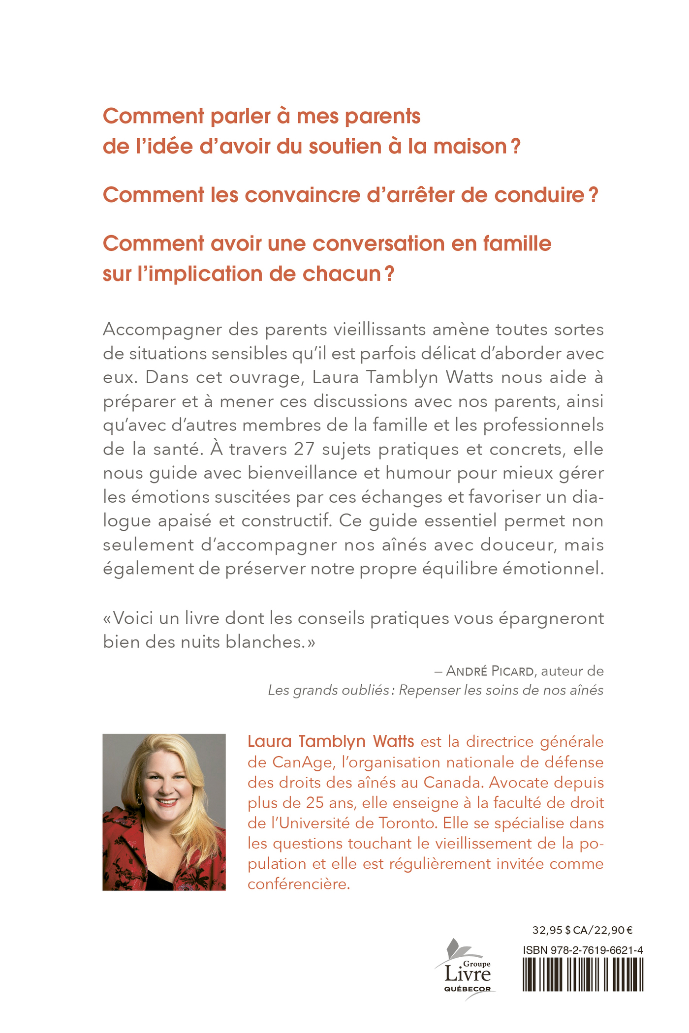Accompagner des parents vieillissants amène toutes sortes de situations sensibles qu'il est parfois délicat d'aborder avec eux. Dans cet ouvrage, Laura Tamblyn Watts nous aide à préparer et à mener ces discussions avec nos parents, ainsi qu'avec d'autres membres de la famille et les professionnels de la santé. À travers 27 sujets pratiques et concrets, elle nous guide avec bienveillance et humour pour mieux gérer les émotions suscitées par ces échanges et favoriser un dialogue apaisé et constructif. Ce guide essentiel permet non seulement d'accompagner nos aînés avec douceur, mais également de préserver notre propre équilibre émotionnel.