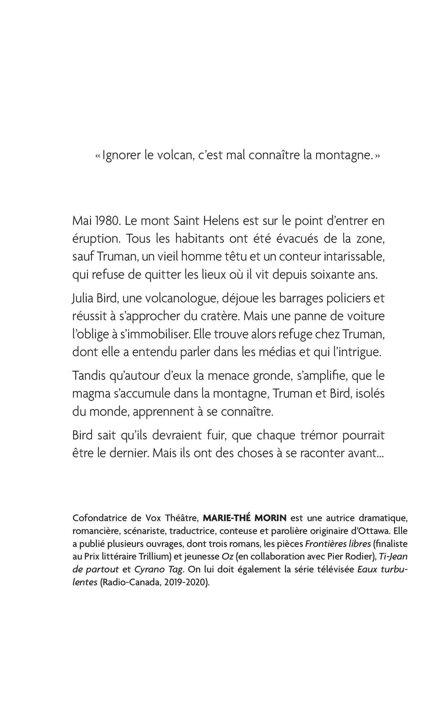 Mai 1980. Le mont Saint Helens est sur le point d’entrer en éruption. Tous les habitants ont été évacués de la zone, sauf Truman, un vieil homme têtu et un conteur intarissable, qui refuse de quitter les lieux où il vit depuis soixante ans.Julia Bird, une volcanologue, déjoue les barrages policiers et réussit à s’approcher du cratère. Mais une panne de voiture l’oblige à s’immobiliser. Elle trouve alors refuge chez Truman, dont elle a entendu parler dans les médias et qui l’intrigue.Tandis qu’autour d’eux la menace gronde, s’amplifie, que le magma s’accumule dans la montagne, Truman et Bird, isolés du monde, apprennent à se connaître. Bird sait qu’ils devraient fuir, que chaque trémor pourrait être le dernier.Mais ils ont des choses à se raconter avant…Drame intime sur fond de catastrophe naturelle, «Le volcan» met en scène un huis clos aussi tendu qu’émouvant.