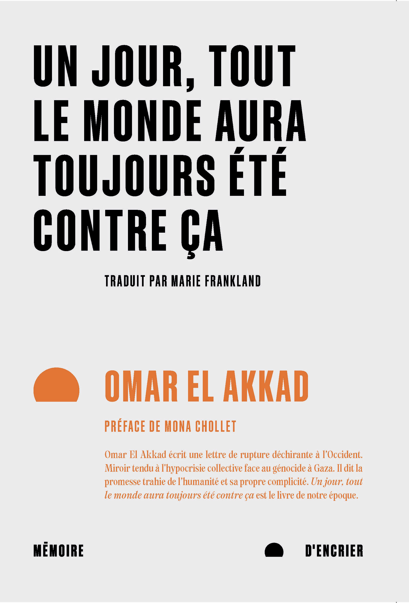 "Un jour, tout le monde aura toujours été contre ça". Cette phrase, écrite au coeur du carnage, est devenue un cri, miroir tendu à l'hypocrisie collective. Omar El Akkad dénonce le silence complice de l'Occident face au massacre de Gaza. Mêlant mémoire, reportage et réflexion politique, il interroge les postures morales vidées de sens, la passivité des progressistes, l'oubli organisé. Un livre sur la justice, la mémoire et la responsabilité.