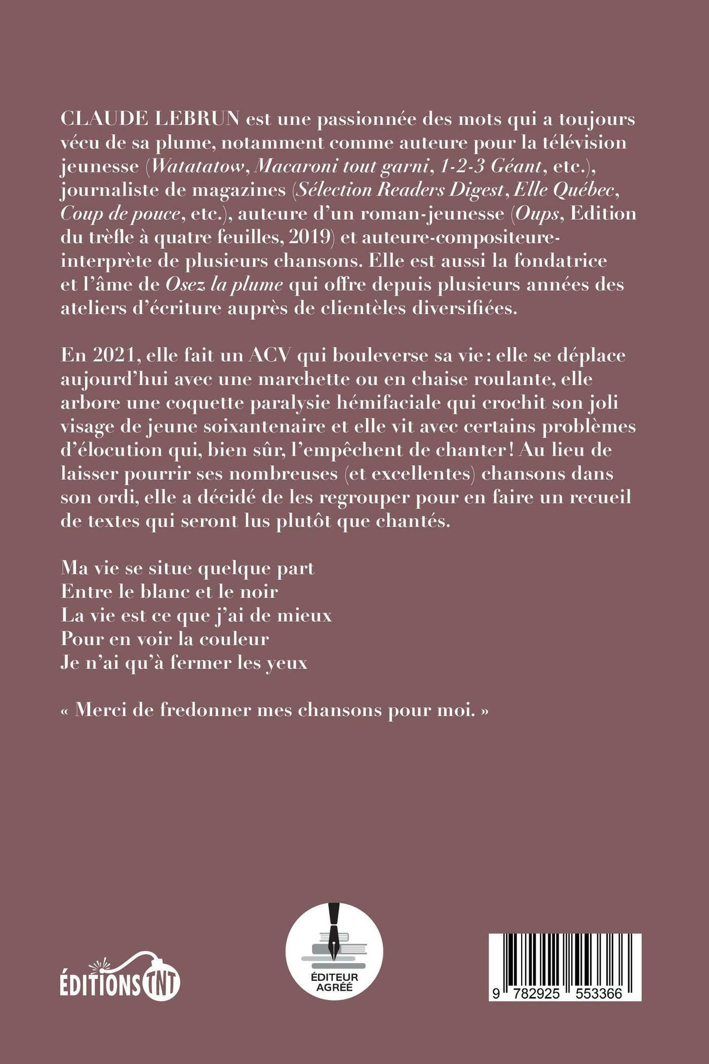CLAUDE LEBRUN est une passionnée des mots qui a toujours vécu de sa plume, notamment comme auteure pour la télévision jeunesse (Watatatow, Macaroni tout garni, 1-2-3 Géant, etc.), journaliste de magazines (Sélection Readers Digest, Elle Québec, Coup de pouce, etc.), auteure d’un roman-jeunesse (Oups, Edition du trèfle à quatre feuilles, 2019) et auteure-compositeure-interprète de plusieurs chansons. Elle est aussi la fondatrice et l’âme de Osez la plume qui offre depuis plusieurs années des ateliers d’écriture auprès de clientèles diversifiées.En 2021, elle fait un ACV qui bouleverse sa vie : elle se déplace aujourd’hui avec une marchette ou en chaise roulante, elle arbore une coquette paralysie hémifaciale qui crochit son joli visage de jeune soixantenaire et elle vit avec certains problèmes d’élocution qui, bien sûr, l’empêchent de chanter ! Au lieu de laisser pourrir ses nombreuses (et excellentes) chansons dans son ordi, elle a décidé de les regrouper pour en faire un recueil de textes qui seront lus plutôt que chantés.Ma vie se situe quelque partEntre le blanc et le noirLa vie est ce que j’ai de mieuxPour en voir la couleurJe n’ai qu’à fermer les yeux« Merci de fredonner mes chansons pour moi. »
