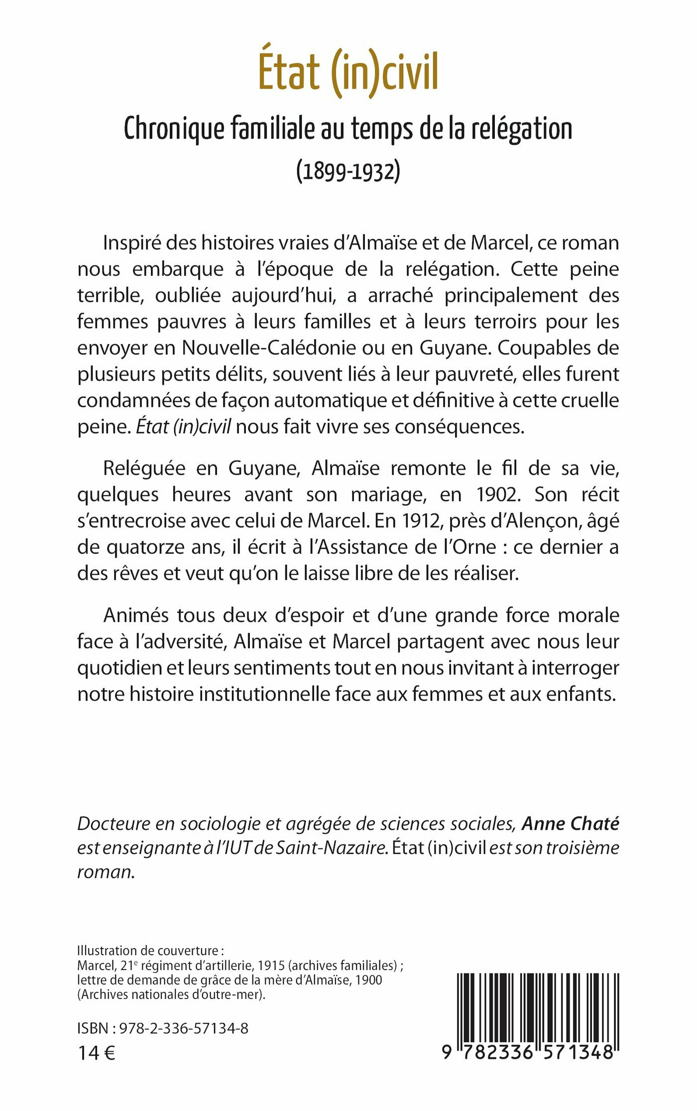 Inspiré des histoires vraies d’Almaïse et de Marcel, ce roman nous embarque à l’époque de la relégation. Cette peine terrible, oubliée aujourd’hui, a arraché principalement des femmes pauvres à leurs familles et à leurs terroirs pour les envoyer en Nouvelle-Calédonie ou en Guyane. Coupables de plusieurs petits délits, souvent liés à leur pauvreté, elles furent condamnées de façon automatique et définitive à cette cruelle peine. État (in)civil nous fait vivre ses conséquences.