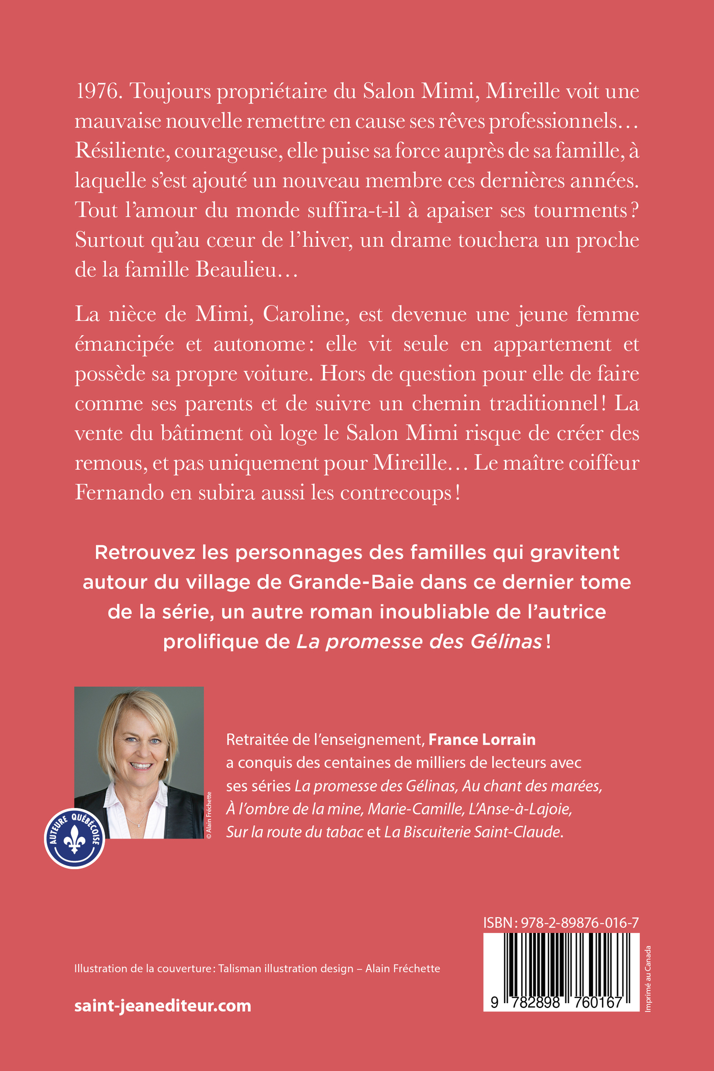 Bien des choses ont changé pour la famille Beaulieu, à Grande-Baie. Si les parents ne se remettront jamais de la mort d’Estelle, cette épreuve, malheureusement, n’est pas la dernière à l’horizon.Mireille, qui est toujours propriétaire du Salon Mimi, a reçu un diagnostic médical qui mettra un frein à son métier de coiffeuse. Elle qui espérait parcourir la province, le pays même, pour participer à des concours de coiffure, se voit contrainte d’abandonner sa passion. Résiliente, elle trouve sa force dans sa famille à laquelle s’est ajoutée Françoise, un bébé adopté à la fin de l’été 1970.Au salon, c’est Caroline qui a pris la relève. Devenue une jeune femme émancipée et autonome, elle vit seule en appartement et possède sa propre voiture. Il est hors de question pour elle de faire comme ses parents et les autres villageoises qui ont choisi de se marier et d’avoir des enfants. Que non! Un amant lui suffit.Un autre drame horrible touchera un proche de la famille Beaulieu et Louis en sera le plus affecté. Fernando, Léontine et les siens, Marie-Paule, Roger, Madeleine et sa propre famille parviendront-ils à l’aider à surmonter ce nouveau malheur?