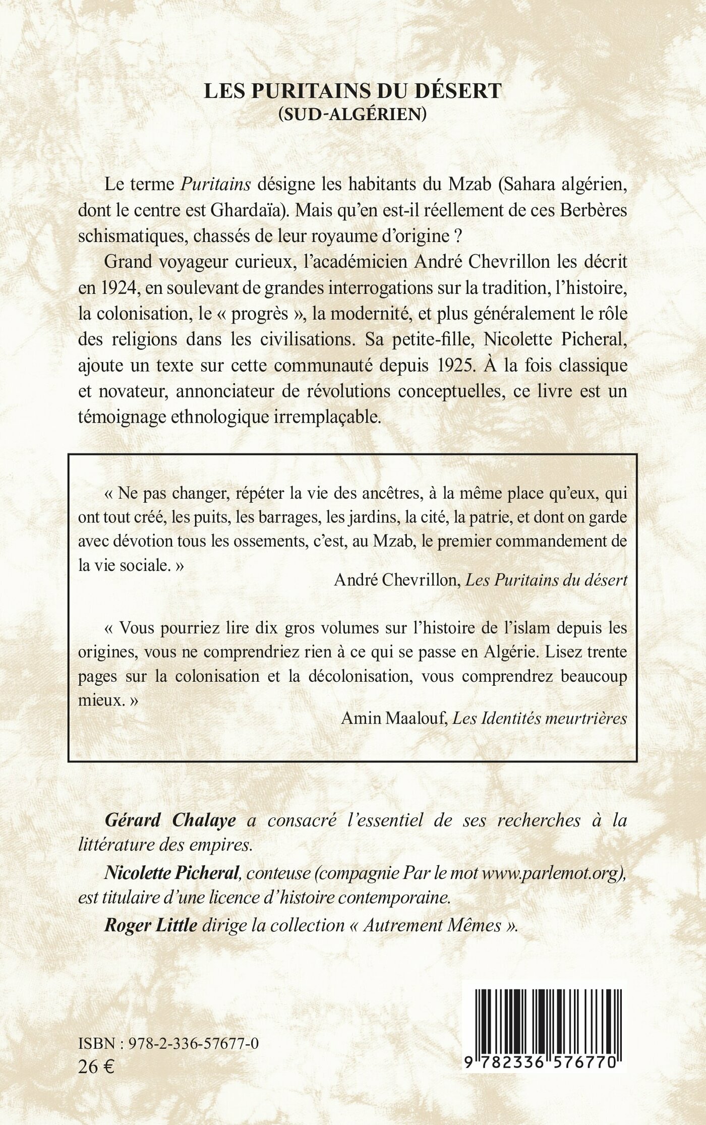 Grand voyageur curieux, l’académicien André Chevrillon les décrit en 1924, en soulevant de grandes interrogations sur la tradition, l’histoire, la colonisation, le « progrès », la modernité, et plus généralement le rôle des religions dans les civilisations. Sa petite-fille, Nicolette Picheral, ajoute un texte sur cette communauté depuis 1925. À la fois classique et novateur, annonciateur de révolutions conceptuelles, ce livre est un témoignage ethnologique irremplaçable.