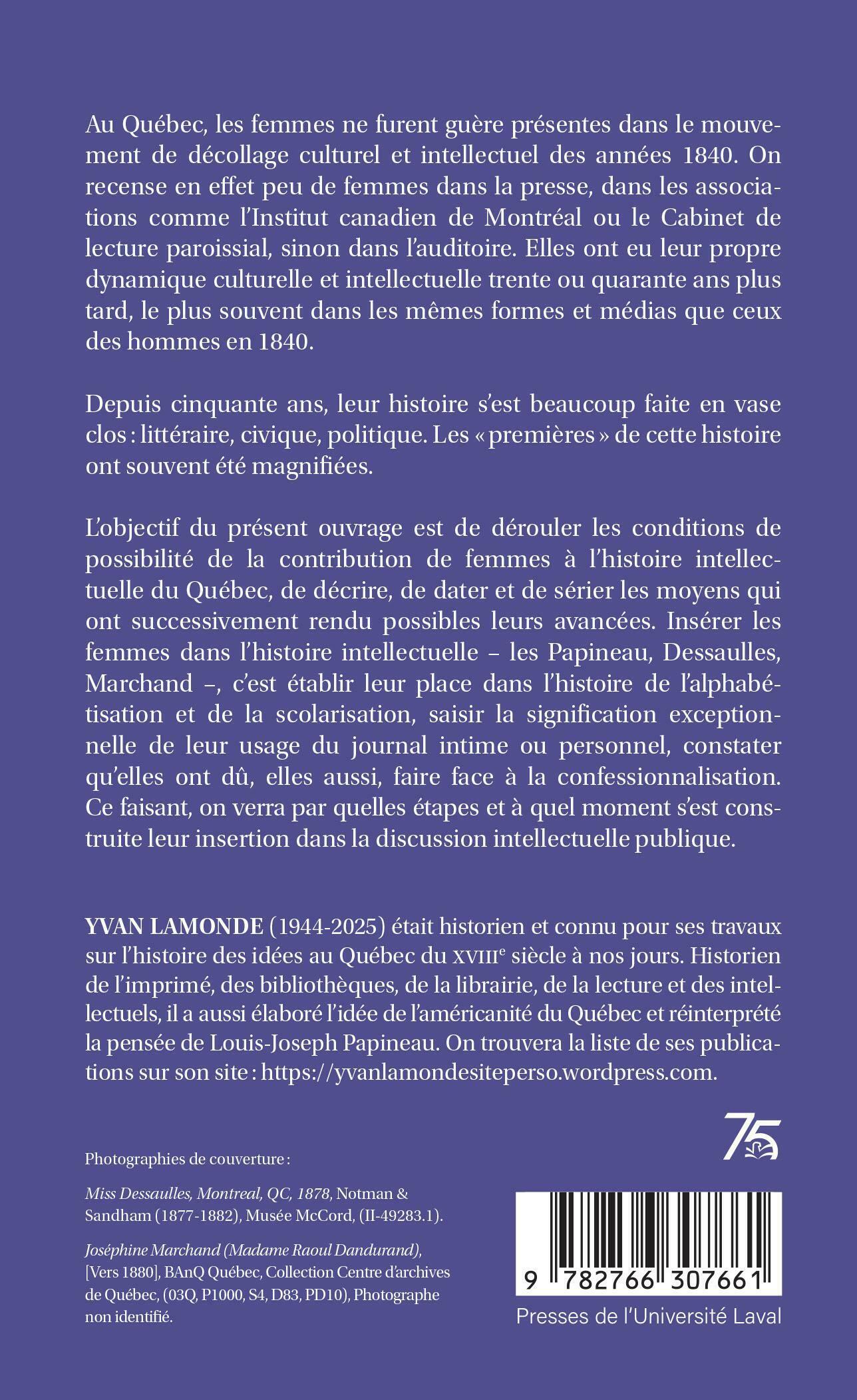 Au Québec, les femmes ne furent guère présentes dans le mouvement de décollage culturel et intellectuel des années 1840. On recense en effet peu de femmes dans la presse, dans les associations comme l’Institut canadien de Montréal ou le Cabinet de lecture paroissial, sinon dans l’auditoire. Elles ont eu leur propre dynamique culturelle et intellectuelle trente ou quarante ans plus tard, le plus souvent dans les mêmes formes et médias que ceux des hommes en 1840. Depuis cinquante ans, leur histoire s’est beaucoup faite en vase clos : littéraire, civique, politique. Les « premières » de cette histoire ont souvent été magnifiées. L’objectif du présent ouvrage est de dérouler les conditions de possibilité de la contribution de femmes à l’histoire intellectuelle du Québec, de décrire, de dater et de sérier les moyens qui ont successivement rendu possibles leurs avancées. Insérer les femmes dans l’histoire intellectuelle – les Papineau, Dessaulles, Marchand –, c’est établir leur place dans l’histoire de l’alphabétisation et de la scolarisation, saisir la signification exceptionnelle de leur usage du journal intime ou personnel, constater qu’elles ont dû, elles aussi, faire face à la confessionnalisation.