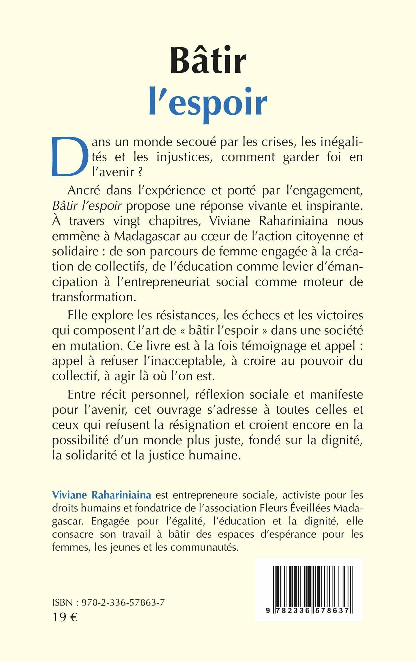 Ancré dans l’expérience et porté par l’engagement, Bâtir l’espoir propose une réponse vivante et inspirante. À travers vingt chapitres, Viviane Rahariniaina nous emmène à Madagascar au cœur de l’action citoyenne et solidaire : de son parcours de femme engagée à la création de collectifs, de l’éducation comme levier d’émancipation à l’entrepreneuriat social comme moteur de transformation.