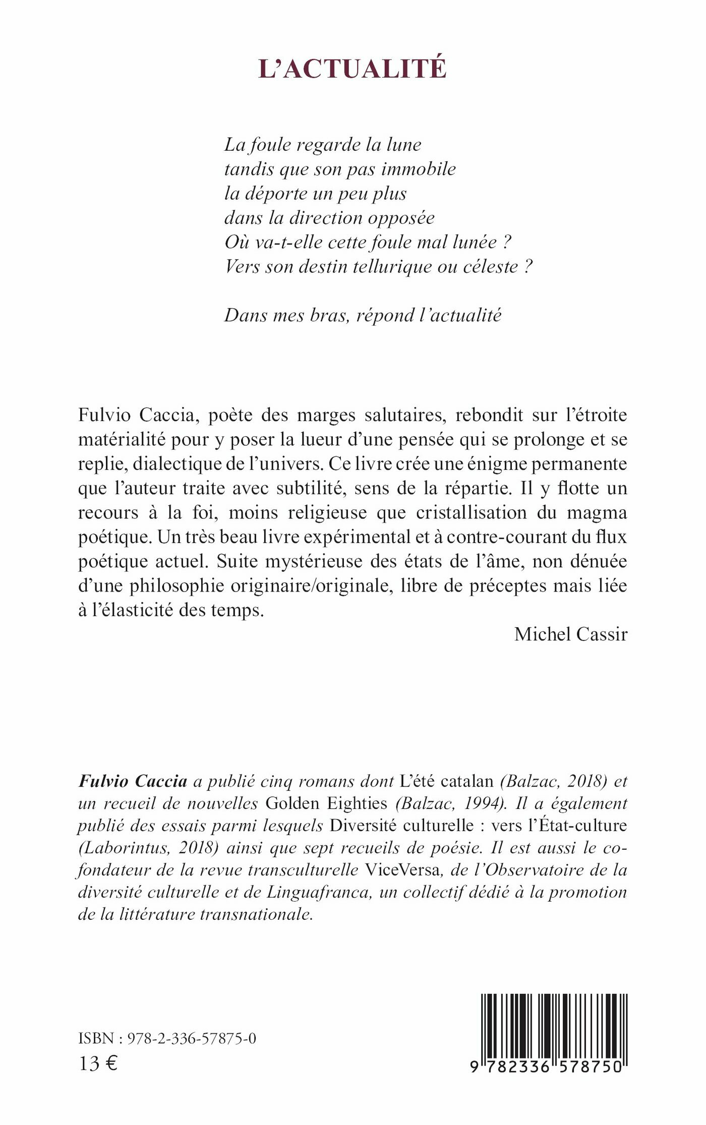 Fulvio Caccia, poète des marges salutaires, rebondit sur l’étroite matérialité pour y poser la lueur d’une pensée qui se prolonge et se replie, dialectique de l’univers. Ce livre crée une énigme permanente que l’auteur traite avec subtilité, sens de la répartie. Il y flotte un recours à la foi, moins religieuse que cristallisation du magma poétique. Un très beau livre expérimental et à contre-courant du flux poétique actuel. Suite mystérieuse des états de l’âme, non dénuée d’une philosophie originaire/originale, libre de préceptes mais liée à l’élasticité des temps.