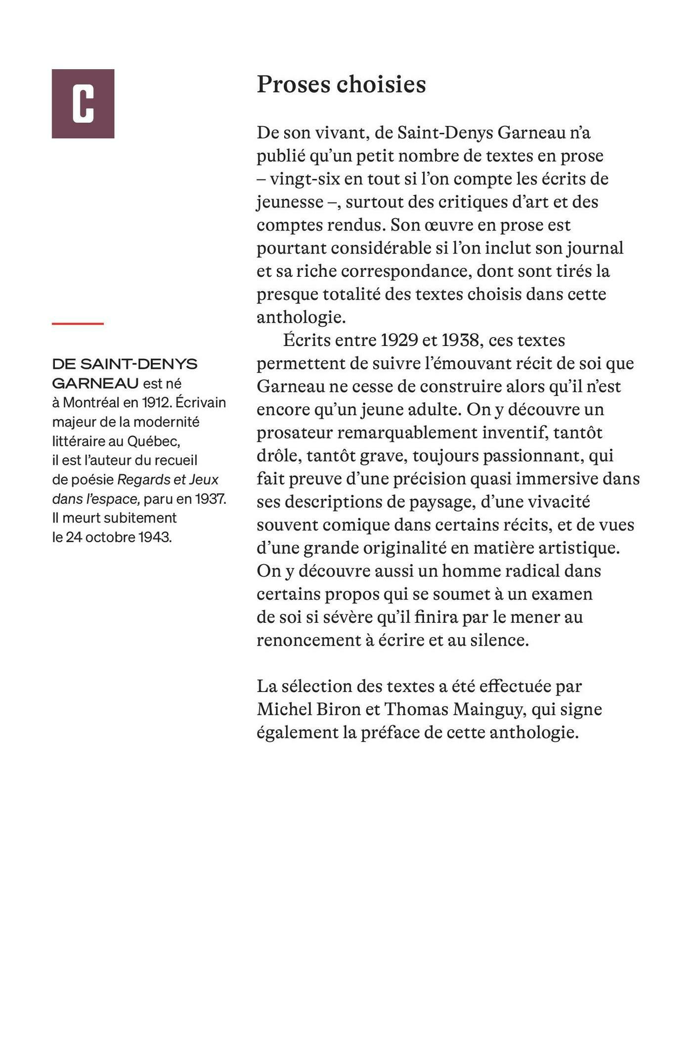 De son vivant, de Saint-Denys Garneau n’a publié qu’un petit nombre de textes en prose – vingt-six en tout si l’on compte les écrits de jeunesse –, surtout des critiques d’art et des comptes rendus. Son œuvre en prose est pourtant considérable si l’on inclut son journal et sa riche correspondance, dont sont tirés la presque totalité des textes choisis dans cette anthologie.