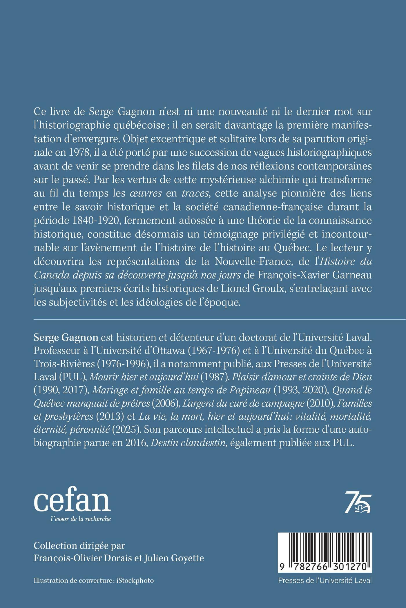 Ce livre de Serge Gagnon n’est ni une nouveauté ni le dernier mot sur l’historiographie québécoise ; il en serait davantage la première manifestation d’envergure. Objet excentrique et solitaire lors de sa parution originale en 1978, il a été porté par une succession de vagues historiographiques avant de venir se prendre dans les filets de nos réflexions contemporaines sur le passé. Par les vertus de cette mystérieuse alchimie qui transforme au fil du temps les œuvres en traces, cette analyse pionnière des liens entre le savoir historique et la société canadienne-française durant la période 1840-1920, fermement adossée à une théorie de la connaissance historique, constitue désormais un témoignage privilégié et incontournable sur l’avènement de l’histoire de l’histoire au Québec. Le lecteur y découvrira les représentations de la Nouvelle-France, de l’Histoire du Canada depuis sa découverte jusqu’à nos jours de François-Xavier Garneau jusqu’aux premiers écrits historiques de Lionel Groulx, s’entrelaçant avec les subjectivités et les idéologies de l’époque.