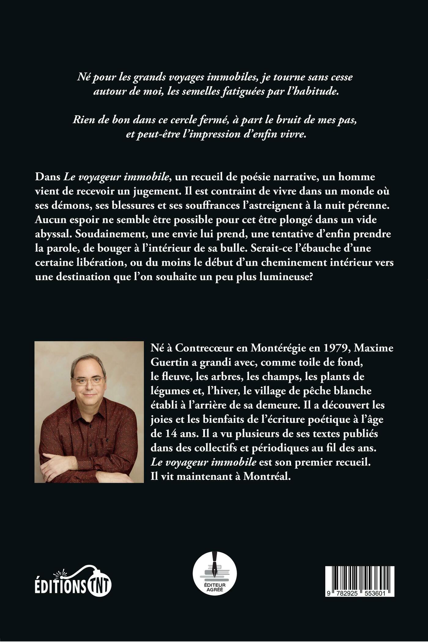 Né pour les grands voyages immobiles, je tourne sans cesse autour de moi, les semelles fatiguées par l’habitude.Rien de bon dans ce cercle fermé, à part le bruit de mes pas, et peut-être l’impression d’enfin vivre.Dans Le voyageur immobile, un recueil de poésie narrative, un homme vient de recevoir un jugement. Il est contraint de vivre dans un monde où ses démons, ses blessures et ses souffrances l’astreignent à la nuit pérenne. Aucun espoir ne semble être possible pour cet être plongé dans un vide abyssal. Soudainement, une envie lui prend, une tentative d’enfin prendre la parole, de bouger à l’intérieur de sa bulle. Serait-ce l’ébauche d’une certaine libération, ou du moins le début d’un cheminement intérieur vers une destination que l’on souhaite un peu plus lumineuse?Né à Contrecœur en Montérégie en 1979, Maxime Guertin a grandi avec, comme toile de fond, le fleuve, les arbres, les champs, les plants de légumes et, l’hiver, le village de pêche blanche établi à l’arrière de sa demeure. Il a découvert les joies et les bienfaits de l’écriture poétique à l’âge de 14 ans. Il a vu plusieurs de ses textes publiés dans des collectifs et périodiques au fil des ans.Le voyageur immobile est son premier recueil.Il vit maintenant à Montréal.