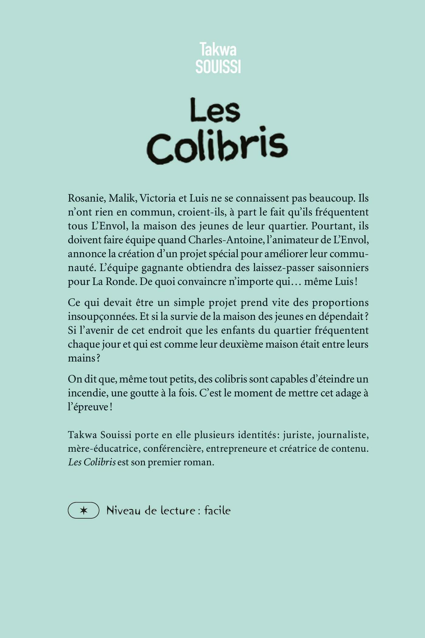 Aujourd’hui, à la maison des jeunes L’Envol, Charles-Antoine, l’animateur, surprend tout le monde avec un projet ambitieux. En équipes de quatre, les enfants ont un peu plus d’un mois pour mettre sur pied un projet pour améliorer la vie de quartier. Le hic ? Les équipes sont imposées. C’est ainsi que Rosanie, Malik, Victoria et Luis, qui ne se connaissent pas beaucoup, se retrouvent à travailler ensemble. Il s’en faut de peu pour qu’ils abandonnent, mais l’équipe gagnante remportera des passes de saison pour La Ronde. De quoi convaincre même les plus récalcitrants… même Luis ! Se mettre d’accord sur un projet n’est pas chose facile. Mais un jour, Malik surprend une conversation entre deux animateurs : L’Envol, ce lieu que les enfants du quartier fréquentent chaque jour et qui est comme leur deuxième maison, est menacé de fermeture. Les quatre compagnons sont unanimes : une telle chose ne peut absolument pas arriver. Ils se lancent alors dans un projet plus grand que nature : empêcher la fermeture de la maison des jeunes de leur quartier. Ramassage de bouteilles, vente de pâtisseries, pétition, hommage vidéo pour plaider leur cause auprès du maire de la ville… Tous les moyens sont bons pour sauver L’Envol ! Après tout, on dit que même tout petit, un colibri est capable d’éteindre un incendie, une goutte à la fois…
