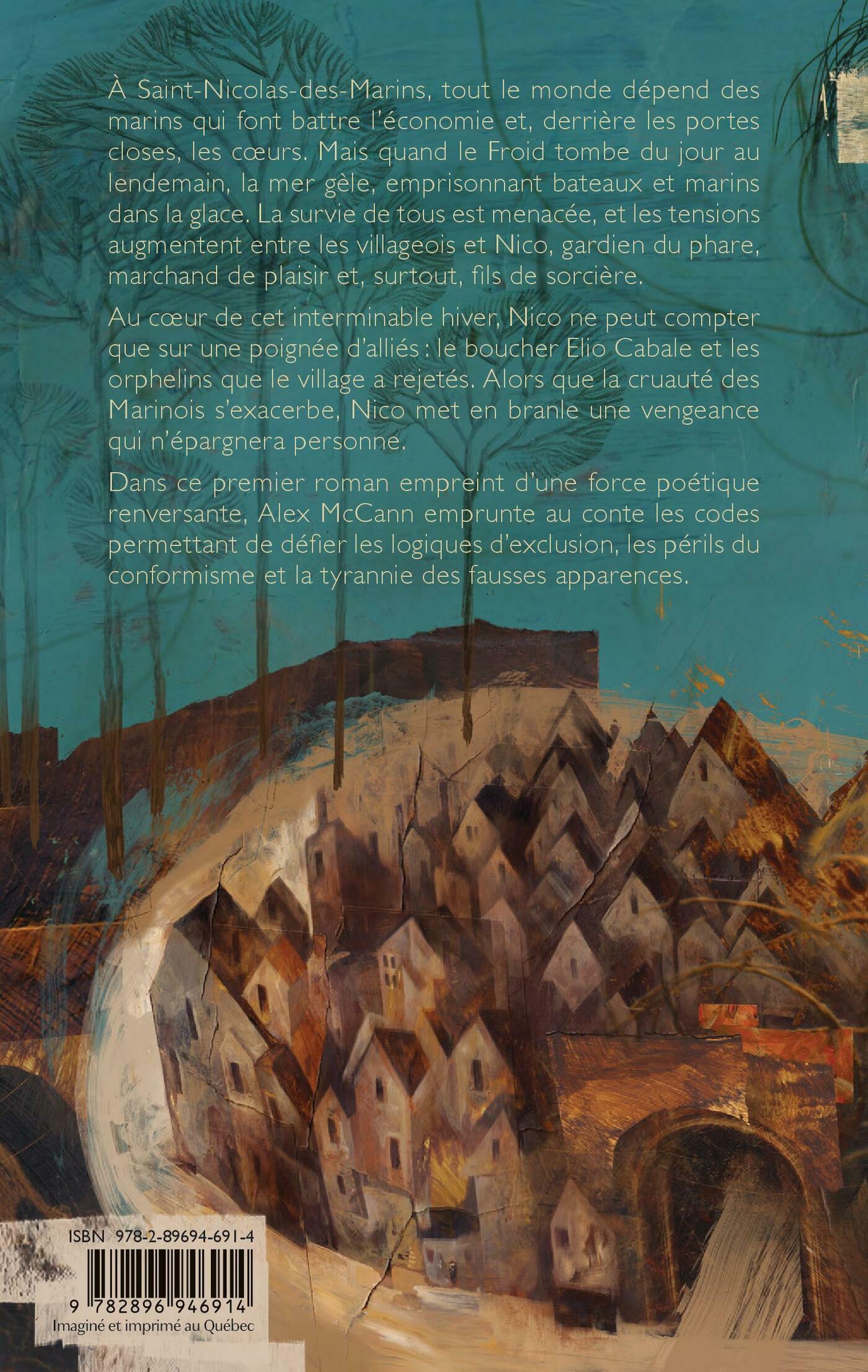 À Saint-Nicolas-des-Marins, tout le monde dépend des marins qui font battre l’économie et, derrière les portes closes, les cœurs. Mais quand le froid tombe du jour au lendemain, la mer gèle, emprisonnant bateaux et marins dans la glace. La survie de tous est menacée, et les tensions augmentent entre les villageois et Nico, gardien du phare, marchand de plaisir et, surtout, fils de sorcière.Au cœur de cet interminable hiver, Nico ne peut compter que sur une poignée d’alliés : le boucher Elio Cabale et les orphelins que le village a rejetés. Alors que la cruauté des Marinois s’exacerbe, Nico met en branle une vengeance qui n’épargnera personne.Dans ce premier roman empreint d’une force poétique renversante, Alex McCann emprunte au conte les codes permettant de défier les logiques d’exclusion, les périls du conformisme et la tyrannie des fausses apparences.