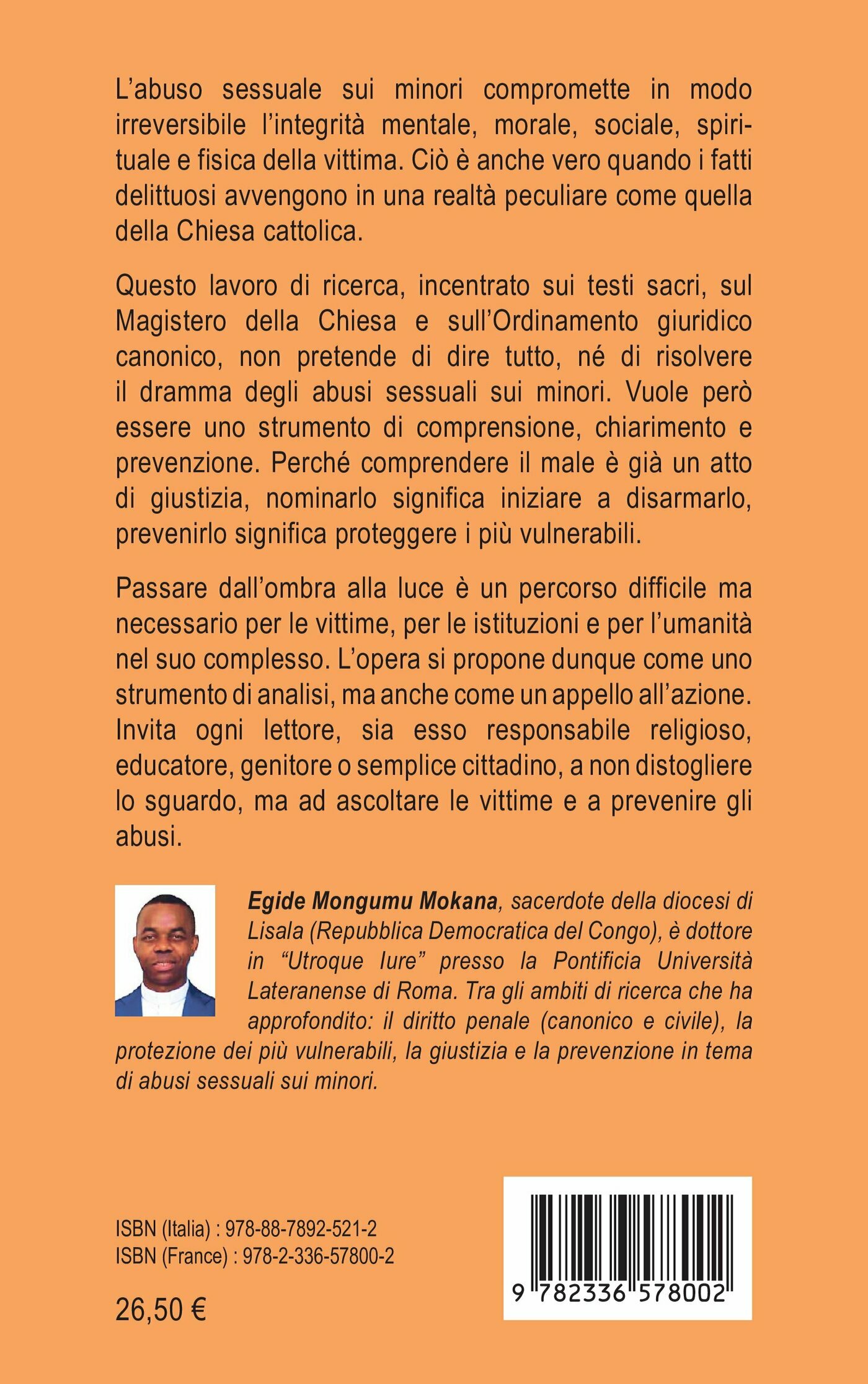 Passare dall’ombra alla luce è un percorso difficile ma necessario per le vittime, per le istituzioni e per l’umanità nel suo complesso. L’opera si propone dunque come uno strumento di analisi, ma anche come un appello all’azione. Invita ogni lettore, sia esso responsabile religioso, educatore, genitore o semplice cittadino, a non distogliere lo sguardo, ma ad ascoltare le vittime e a prevenire gli abusi.