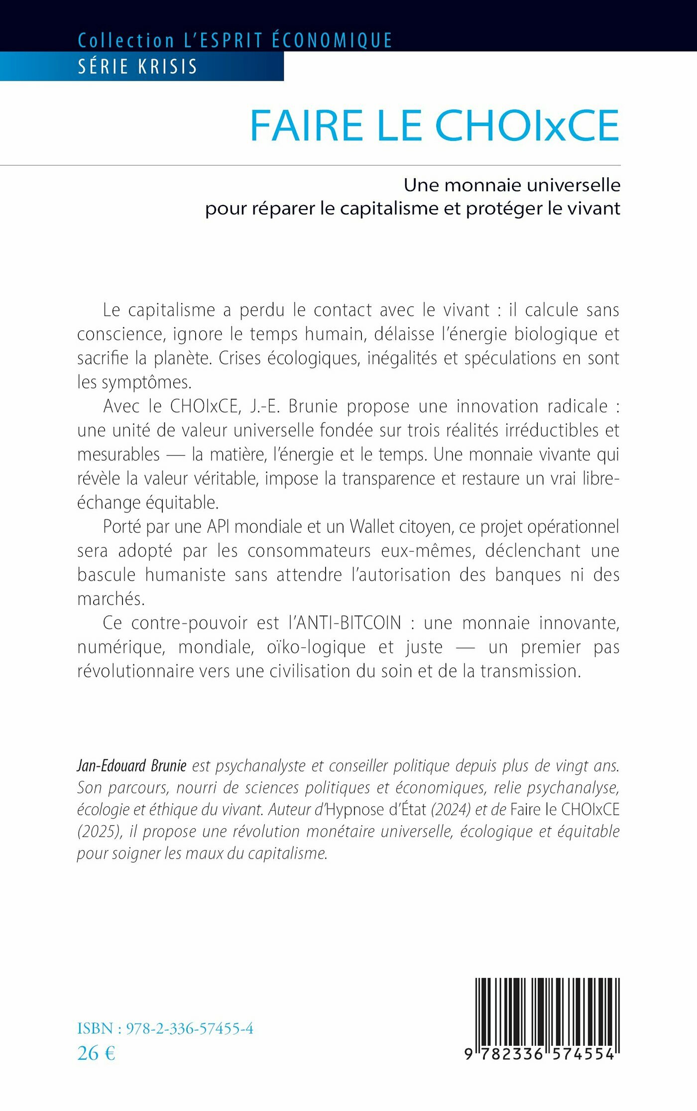 Avec le CHOIxCE, J.-E. Brunie propose une innovation radicale : une unité de valeur universelle fondée sur trois réalités irréductibles et mesurables — la matière, l’énergie et le temps. Une monnaie vivante qui révèle la valeur véritable, impose la transparence et restaure un vrai libre-échange équitable.