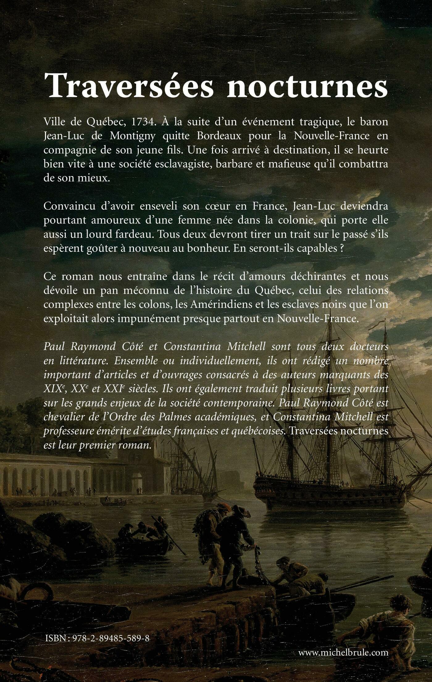 Ville de Québec, 1734. A la suite d'un événement tragique, le baron Jean-Luc de Montigny quitte Bordeaux pour la Nouvelle-France en compagnie de son jeune fils. Une fois arrivé à destination, il se heurte bien vite à une société esclavagiste, barbare et mafieuse qu'il combattra de son mieux.Convaincu d'avoir enseveli son coeur en France, Jean-Luc deviendra pourtant amoureux d'une femme née dans la colonie, qui porte elle aussi un lourd fardeau. Tous deux devront tirer un trait sur le passé s'ils espèrent goûter à nouveau au bonheur. En seront-ils capables ?Ce roman nous entraine dans le récit d'amours déchirantes et nous dévoile un pan méconnu de l'histoire du Québec, celui des relations complexes entre les colons, les Amérindiens et les esclaves noirs que l'on exploitait alors impunément presque partout en Nouvelle-France.