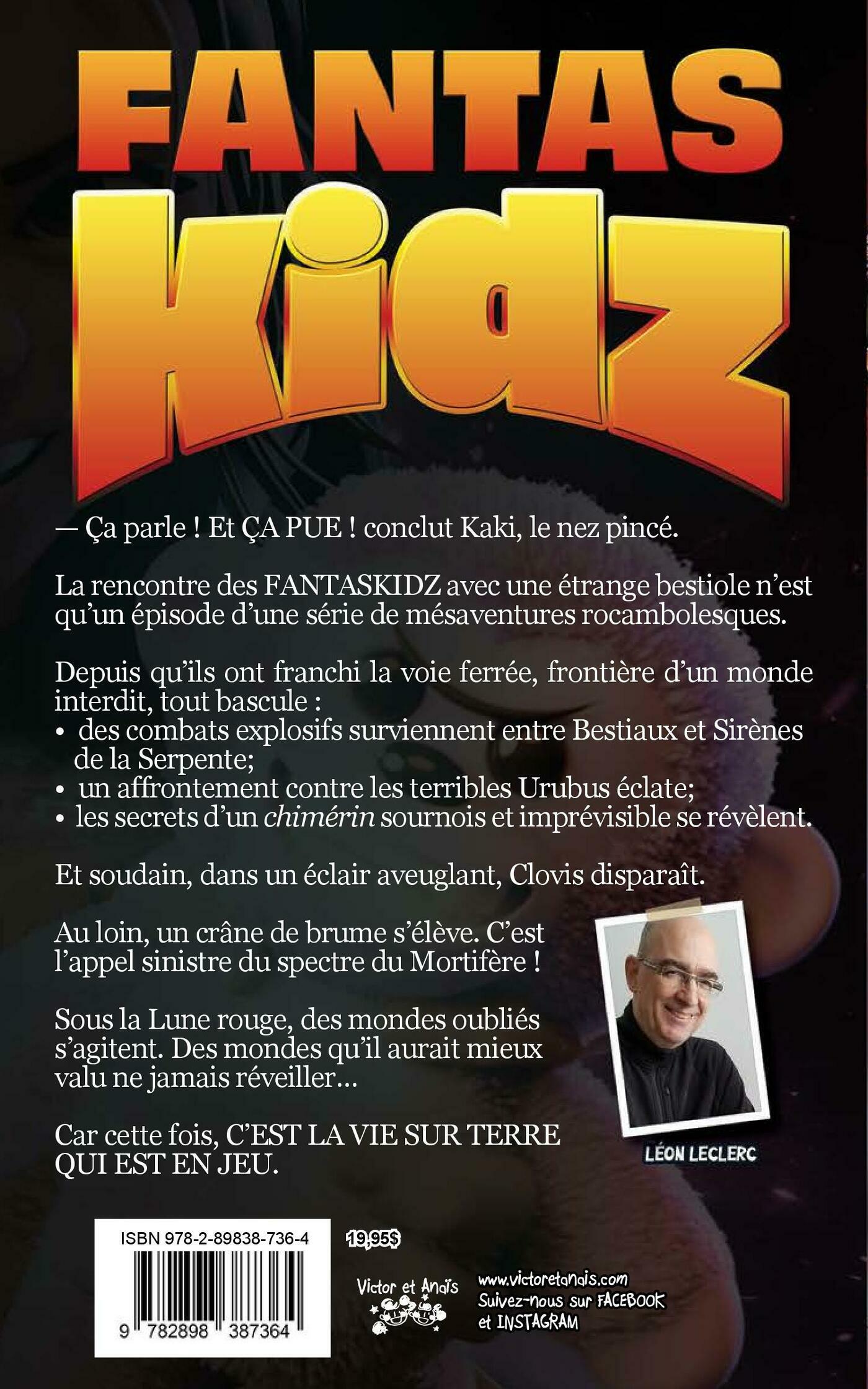 — Ça parle ! Et ÇA PUE ! conclut Kaki, le nez pincé. La rencontre des FANTASKIDZ avec une étrange bestiole n’est qu’un épisode d’une série de mésaventures rocambolesques. Depuis qu’ils ont franchi la voie ferrée, frontière d’un monde interdit, tout bascule : • des combats explosifs surviennent entre Bestiaux et Sirènes de la Serpente; • un affrontement contre les terribles Urubus éclate; • les secrets d’un chimérin sournois et imprévisible se révèlent. Et soudain, dans un éclair aveuglant, Clovis disparaît. Au loin, un crâne de brume s’élève. C’est l’appel sinistre du spectre du Mortifère ! Sous la Lune rouge, des mondes oubliés s’agitent. Des mondes qu’il aurait mieux valu ne jamais réveiller… Car cette fois, C’EST LA VIE SUR TERRE QUI EST EN JEU.