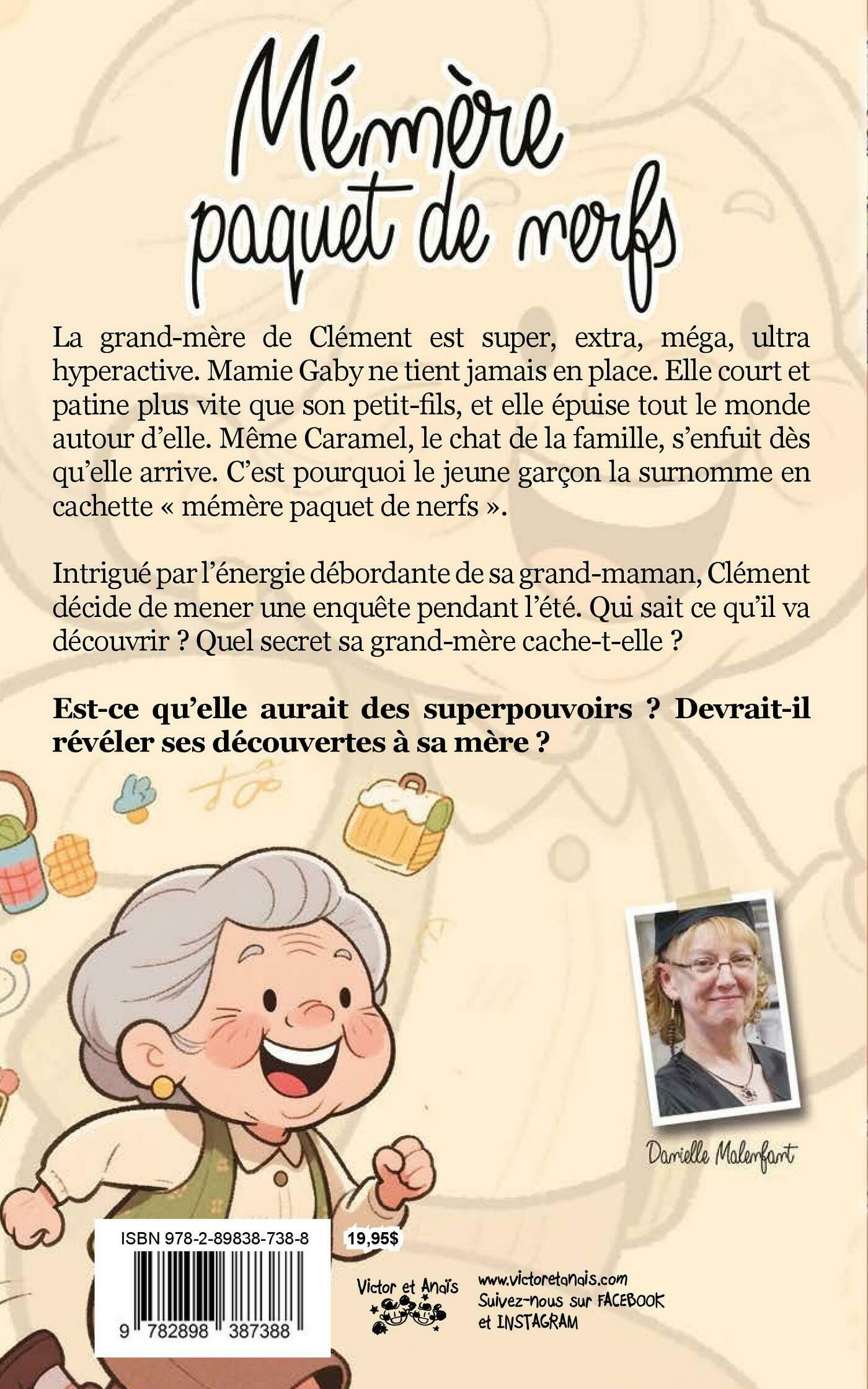 La grand-mère de Clément est super, extra, méga, ultra hyperactive. Mamie Gaby ne tient jamais en place. Elle court et patine plus vite que son petit-fils, et elle épuise tout le monde autour d’elle. Même Caramel, le chat de la famille, s’enfuit dès qu’elle arrive. C’est pourquoi le jeune garçon la surnomme en cachette « mémère paquet de nerfs ». Intrigué par l’énergie débordante de sa grand-maman, Clément décide de mener une enquête pendant l’été. Qui sait ce qu’il va découvrir ? Quel secret sa grand-mère cache-t-elle ? Est-ce qu’elle aurait des superpouvoirs ? Devrait-il révéler ses découvertes à sa mère ?