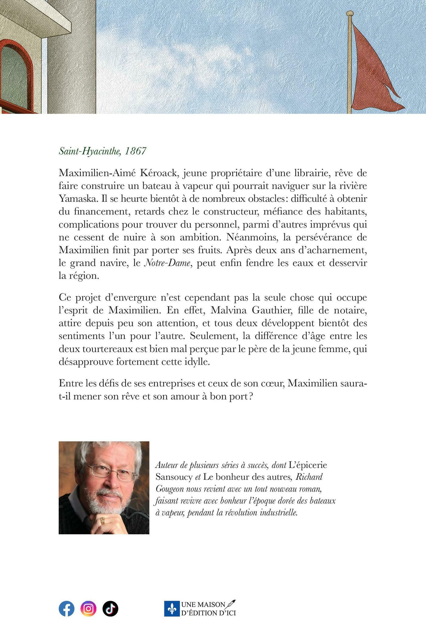 Saint-Hyacinthe, 1867Maximilien-Aimé Kéroack, jeune propriétaire d’une librairie, rêve de faire construire un bateau à vapeur qui pourrait naviguer sur la rivière Yamaska. Il se heurte bientôt à de nombreux obstacles : difficulté à obtenir du financement, retards chez le constructeur, méfiance des habitants, complications pour trouver du personnel, parmi d’autres imprévus qui ne cessent de nuire à son ambition. Néanmoins, la persévérance de Maximilien finit par porter ses fruits. Après deux ans d’acharnement, le grand navire, leNotre-Dame, peut enfin fendre les eaux et desservir la région.Ce projet d’envergure n’est cependant pas la seule chose qui occupe l’esprit de Maximilien. En effet, Malvina Gauthier, fille de notaire, attire depuis peu son attention, et tous deux développent bientôt dessentiments l’un pour l’autre. Seulement, la différence d’âge entre les deux tourtereaux est bien mal perçue par le père de la jeune femme, qui désapprouve fortement cette idylle.Entre les défis de ses entreprises et ceux de son cœur, Maximilien saura-t-il mener son rêve et son amour à bon port ?