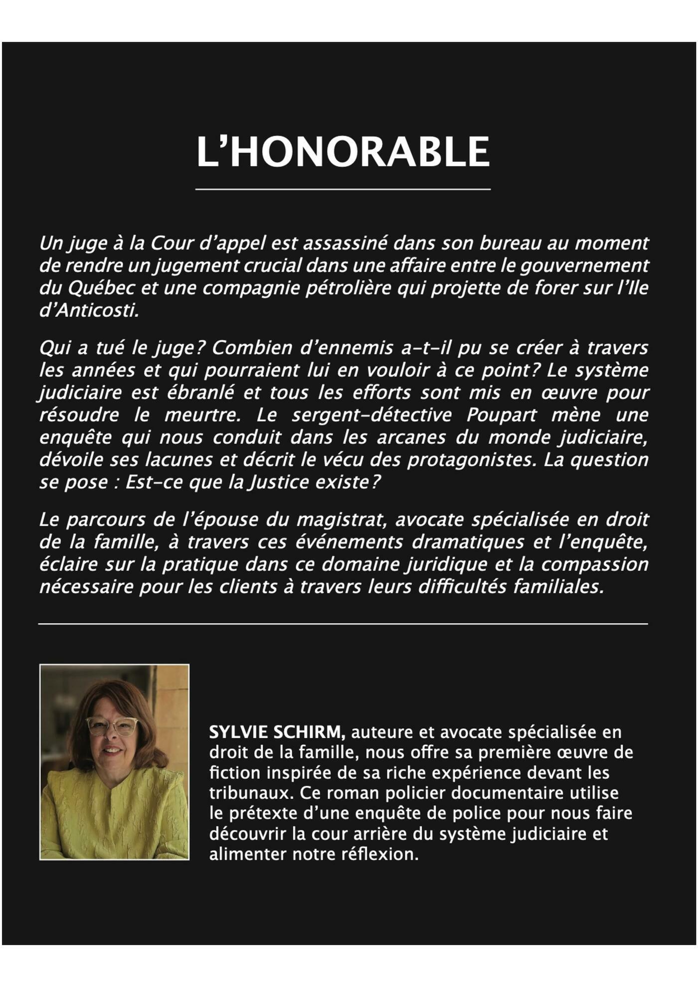 Un juge à la Cour d’appel est assassinédans son bureau, au moment de rendreun jugement crucial dans une a!aireentre le gouvernement du Québec et unecompagnie pétrolière qui projette deforer sur l'Ile d’Anticosti.Qui a tué le juge? Combien d’ennemis a-t-il pu se créer à travers les années etqui pourraient lui en vouloir à ce point ?Le système judiciaire est ébranlé et tousles efforts sont mis pour résoudre lemeurtre. Le sergent-détective Poupartmène une enquête qui nous conduitdans les arcanes du monde judiciaire,dévoile ses lacunes, et décrit le vécu desprotagonistes. La question se pose: est-ce que la Justice existe?Le parcours de l’épouse du magistrat,avocate spécialisée en droit de lafamille, à travers ces événementsdramatiques, éclaire sur la pratiquedans ce domaine juridique et lacompassion nécessaire pour les clientsà travers leurs difficultés familiales.