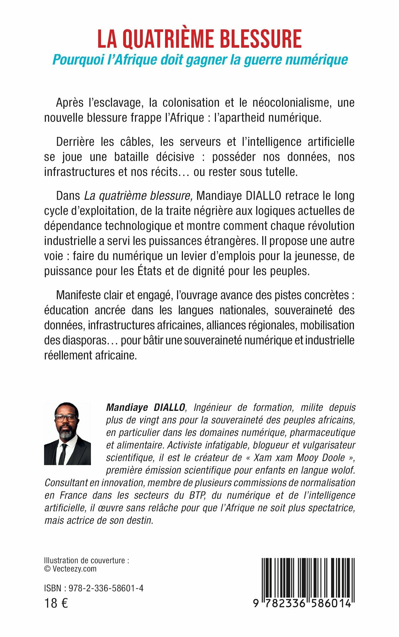 Dans La Quatrième blessure, Mandiaye DIALLO retrace le long cycle d’exploitation, de la traite négrière aux logiques actuelles de dépendance technologique et montre comment chaque révolution industrielle a servi les puissances étrangères. Il propose une autre voie : faire du numérique un levier d’emplois pour la jeunesse, de puissance pour les États et de dignité pour les peuples.