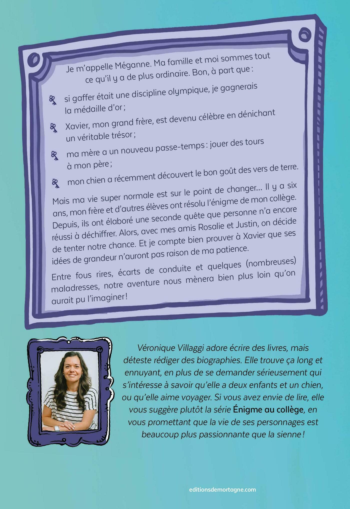 Je m’appelle Méganne. Ma famille et moi sommes tout ce qu’il y a de plus ordinaire. Bon, à part que :-si gaffer était une discipline olympique, je gagnerais la médaille d’or ;-Xavier, mon grand frère, est devenu célèbre en dénichant un véritable trésor ;-ma mère a un nouveau passe-temps : jouer des tours à mon père ;-mon chien a récemment découvert le bon goût des vers de terre.Mais ma vie super normale est sur le point de changer… Il y a six ans, mon frère et d’autres élèves ont résolu l’énigme de mon collège. Depuis, ils ont élaboré une seconde quête que personne n’a encore réussi à déchiffrer. Alors, avec mes amis Rosalie et Justin, on décide de tenter notre chance. Et je compte bien prouver à Xavier que ses idées de grandeur n’auront pas raison de ma patience.Entre fous rires, écarts de conduite et quelques (nombreuses) maladresses, notre aventure nous mènera bien plus loin qu’on aurait pu l’imaginer !
