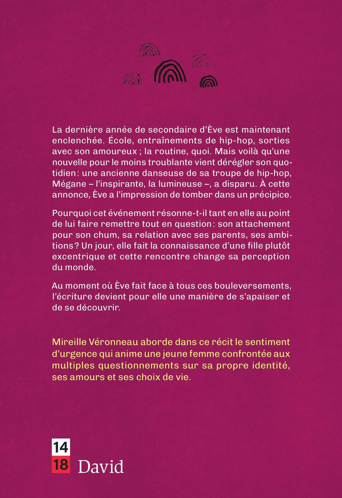 La dernière année de secondaire d’Ève est maintenant enclenchée. École, entraînements de hip-hop, sorties avec son amoureux ; la routine, quoi. Mais voilà qu’une nouvelle pour le moins troublante vient dérégler son quotidien : une ancienne danseuse de sa troupe de hip-hop, Mégane – l’inspirante, la lumineuse –, a disparu. À cette annonce, Ève a l’impression de tomber dans un précipice.Pourquoi cet événement résonne-t-il tant en elle au point de lui faire remettre tout en question : son attachement pour son chum, sa relation avec ses parents, ses ambitions ? Un jour, elle fait la connaissance d’une fille plutôt excentrique et cette rencontre change sa perception du monde.Au moment où Ève fait face à tous ces bouleversements, l’écriture devient pour elle une manière de s’apaiser et de se découvrir.