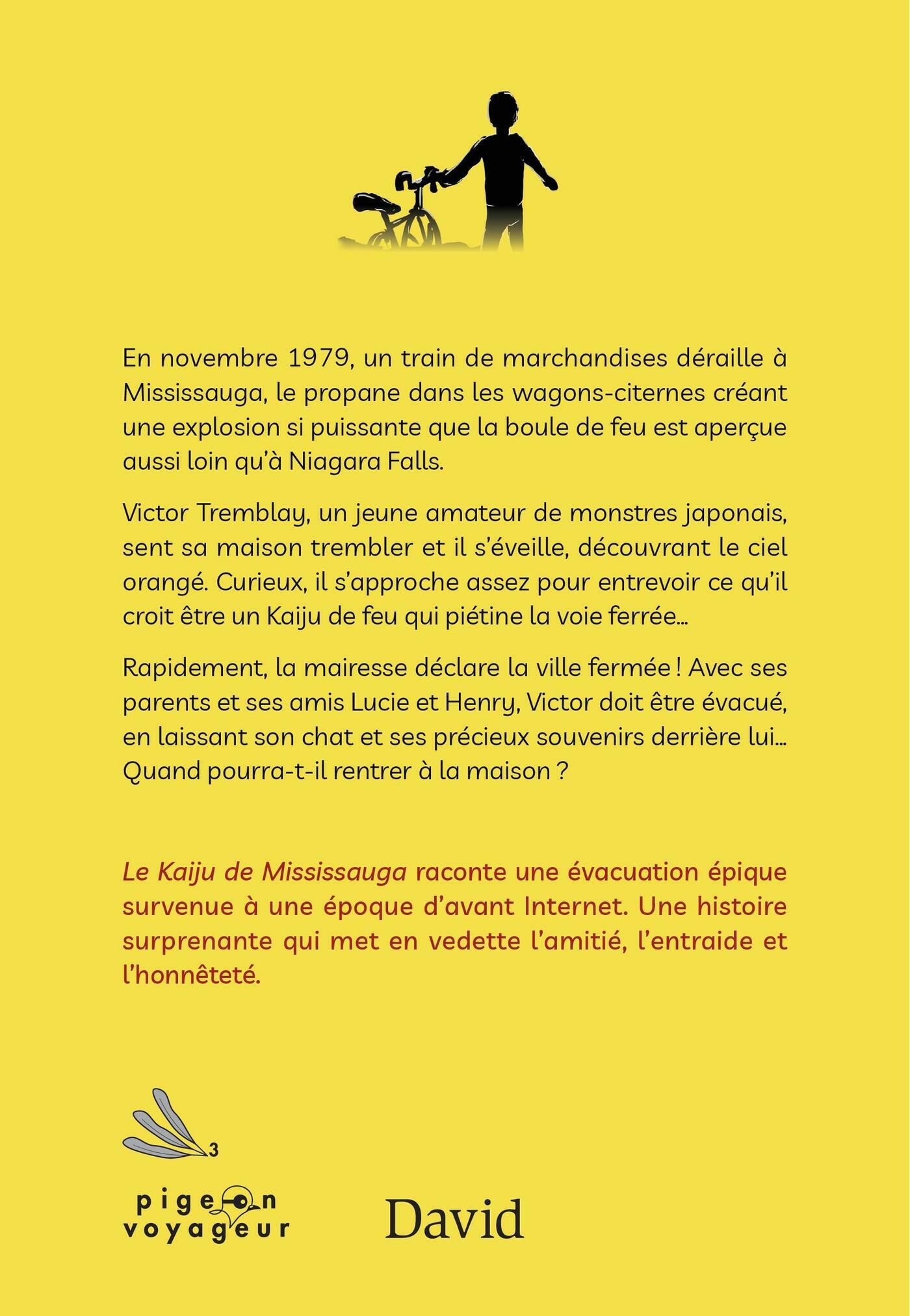 En novembre 1979, un train de marchandises déraille à Mississauga, le propane dans les wagons-citernes créant une explosion si puissante que la boule de feu est aperçue aussi loin qu’à Niagara Falls.Victor Tremblay, un jeune amateur de monstres japonais, sent sa maison trembler et il s’éveille, découvrant le ciel orangé. Curieux, il s’approche assez pour entrevoir ce qu’il croit être un Kaiju de feu qui piétine la voie ferrée…Rapidement, la mairesse déclare la ville fermée ! Avec ses parents et ses amis Lucie et Henry, Victor doit être évacué, en laissant son chat et ses précieux souvenirs derrière lui… Quand pourra-t-il rentrer à la maison ?Le Kaiju de Mississauga raconte une évacuation épique survenue à une époque d’avant Internet. Une histoire surprenante qui met en vedette l’amitié, l’entraide et l’honnêteté.