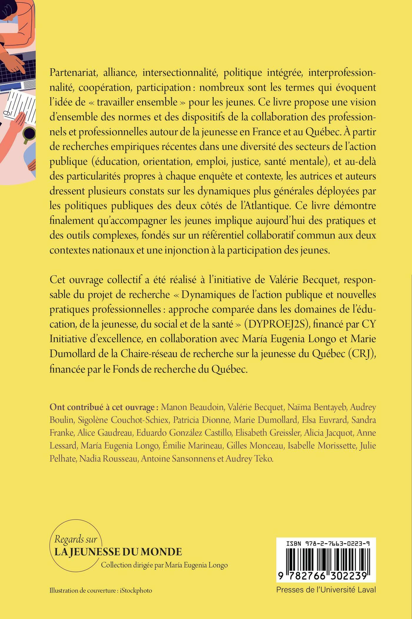 Partenariat, alliance, intersectionnalité, politique intégrée, interprofessionnalité, coopération, participation : nombreux sont les termes qui évoquent l’idée de « travailler ensemble » pour les jeunes. Ce livre propose une vision d’ensemble des normes et des dispositifs de la collaboration des professionnels et professionnelles autour de la jeunesse en France et au Québec. À partir de recherches empiriques récentes dans une diversité des secteurs de l’action publique (éducation, orientation, emploi, justice, santé mentale), et au-delà des particularités propres à chaque enquête et contexte, les autrices et auteurs dressent plusieurs constats sur les dynamiques plus générales déployées par les politiques publiques des deux côtés de l’Atlantique. Ce livre démontre finalement qu’accompagner les jeunes implique aujourd’hui des pratiques et des outils complexes, fondés sur un référentiel collaboratif commun aux deux contextes nationaux et une injonction à la participation de la part des jeunes.