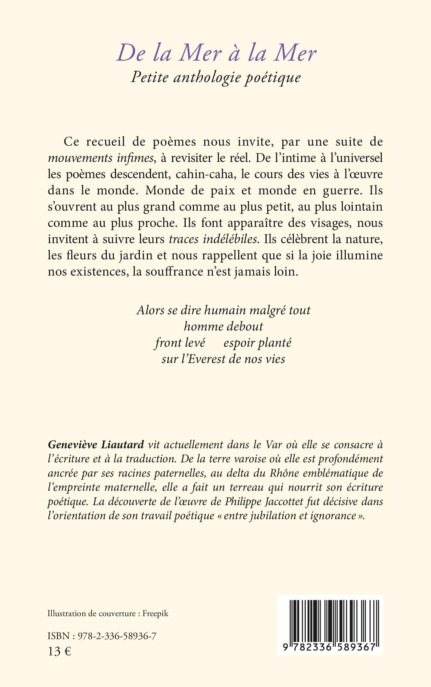 Ce recueil de poèmes nous invite, par une suite de mouvements infimes, à revisiter le réel. De l’intime à l’universel les poèmes descendent, cahin-caha, le cours des vies à l’œuvre dans le monde. Monde de paix et monde en guerre. Ils s’ouvrent au plus grand comme au plus petit, au plus lointain comme au plus proche. Ils font apparaître des visages, nous invitent à suivre leurs traces indélébiles. Ils célèbrent la nature, les fleurs du jardin et nous rappellent que si la joie illumine nos existences, la souffrance n’est jamais loin.