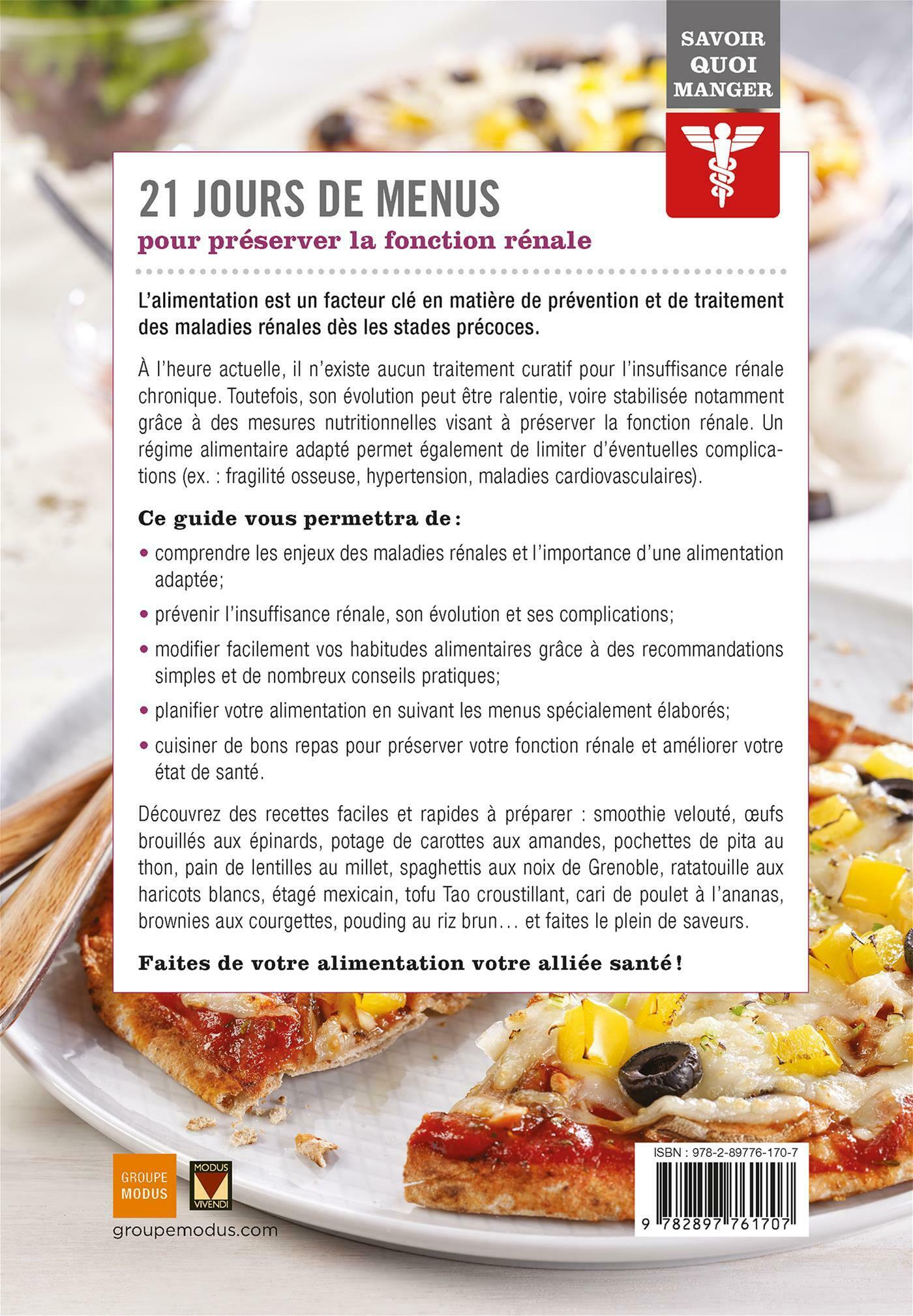 cuisiner de bons repas pour préserver votre fonction rénale et améliorer votre état de santé.Découvrez des recettes faciles et rapides à préparer : smoothie velouté, œufs brouillés aux épinards, potage de carottes aux amandes, pochettes de pita au thon, pain de lentilles au millet, spaghettis aux noix de Grenoble, ratatouille aux haricots blancs, étagé mexicain, tofu Tao croustillant, cari de poulet à l'ananas, brownies aux courgettes, pouding au riz brun … et faites le plein de saveurs.
