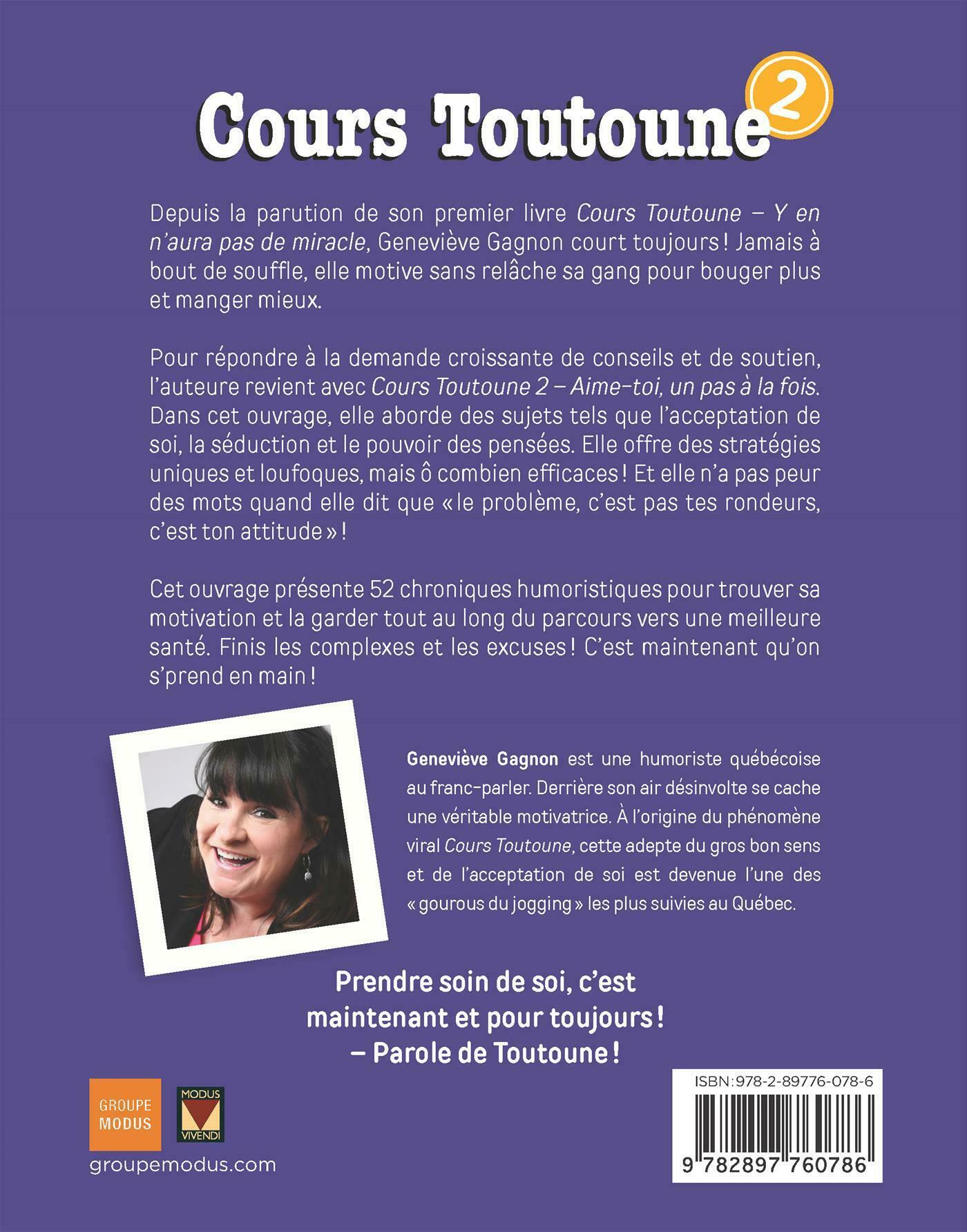 Depuis la parution de son premier livre Cours Toutoune – Y en n'aura pas de miracle, Geneviève Gagnon court toujours ! Jamais à bout de souffle, elle motive sans relâche sa gang pour bouger plus et manger mieux. Son message: «Prendre soin de soi, c'est maintenant et pour toujours!»