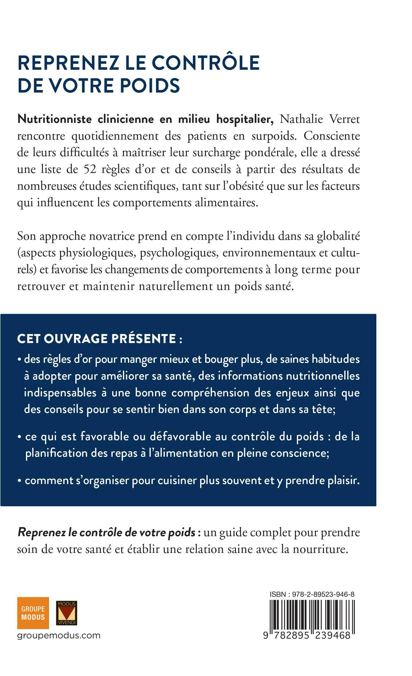 Nutritionniste clinicienne en milieu hospitalier, Nathalie Verret rencontre quotidiennement des patients en surpoids. Consciente de leurs difficultés à maîtriser leur surcharge pondérale, elle a dressé une liste de règles d'or et de conseils à partir des résultats de nombreuses études scientifiques tant sur l'obésité que sur les facteurs qui influencent les comportements alimentaires.