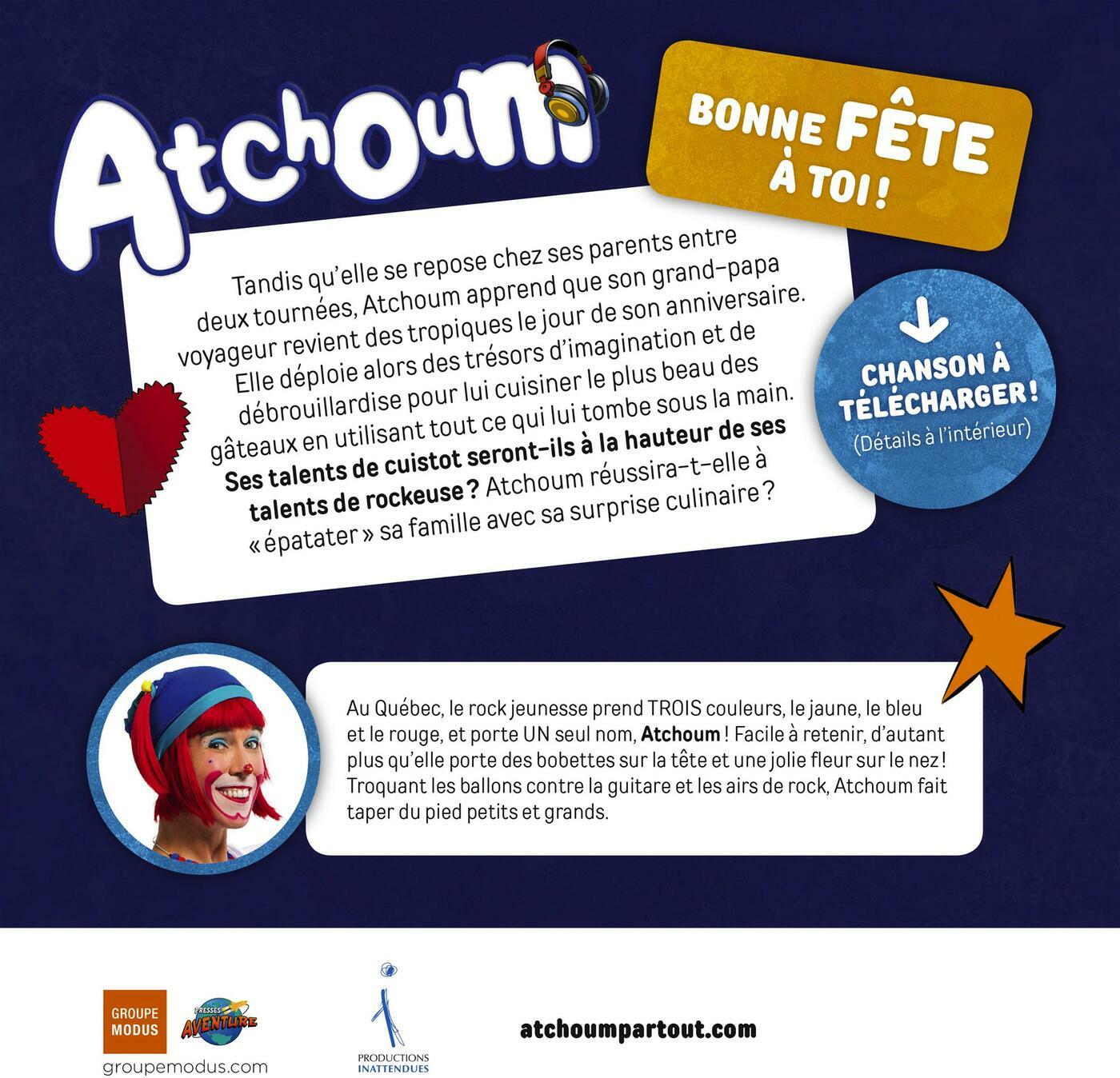 Tandis qu'elle se repose chez ses parents entre deux tournées, Atchoum apprend que son grand-papa voyageur revient des tropiques le jour de son anniversaire. Elle déploie alors des trésors d'imagination et de débrouillardise pour lui cuisiner le plus beau des gâteaux en utilisant tout ce qui lui tombe sous la main. Ses talents de cuistot seront-ils à la hauteur de ses talents de rockeuse ? Atchoum réussira-t-elle à « épatater » sa famille avec sa surprise culinaire ?