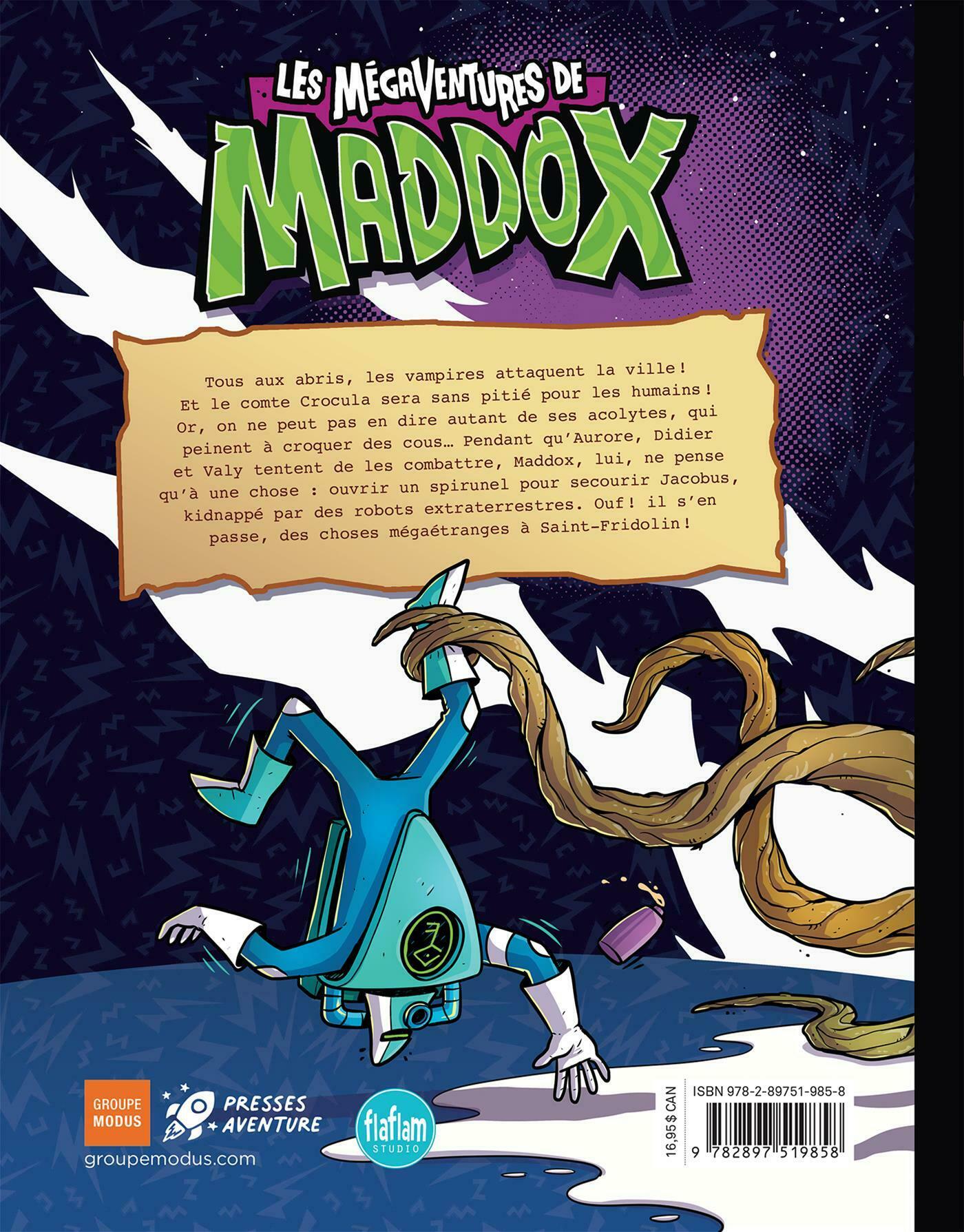 Tous aux abris, les vampires attaquent la ville! Et le comte Crocula sera sans pitié pour les humains! Or, on ne peut pas en dire autant de ses acolytes, qui peinent à croquer des cous… Pendant qu'Aurore, Didier et Valy tentent de les combattre, Maddox, lui, ne pense qu'à une chose: ouvrir un spirunel pour secourir Jacbobus, kidnappé par des robots extraterrestres. Ouf! il s'en passe, des choses mégaétranges à Saint-Fridolin!