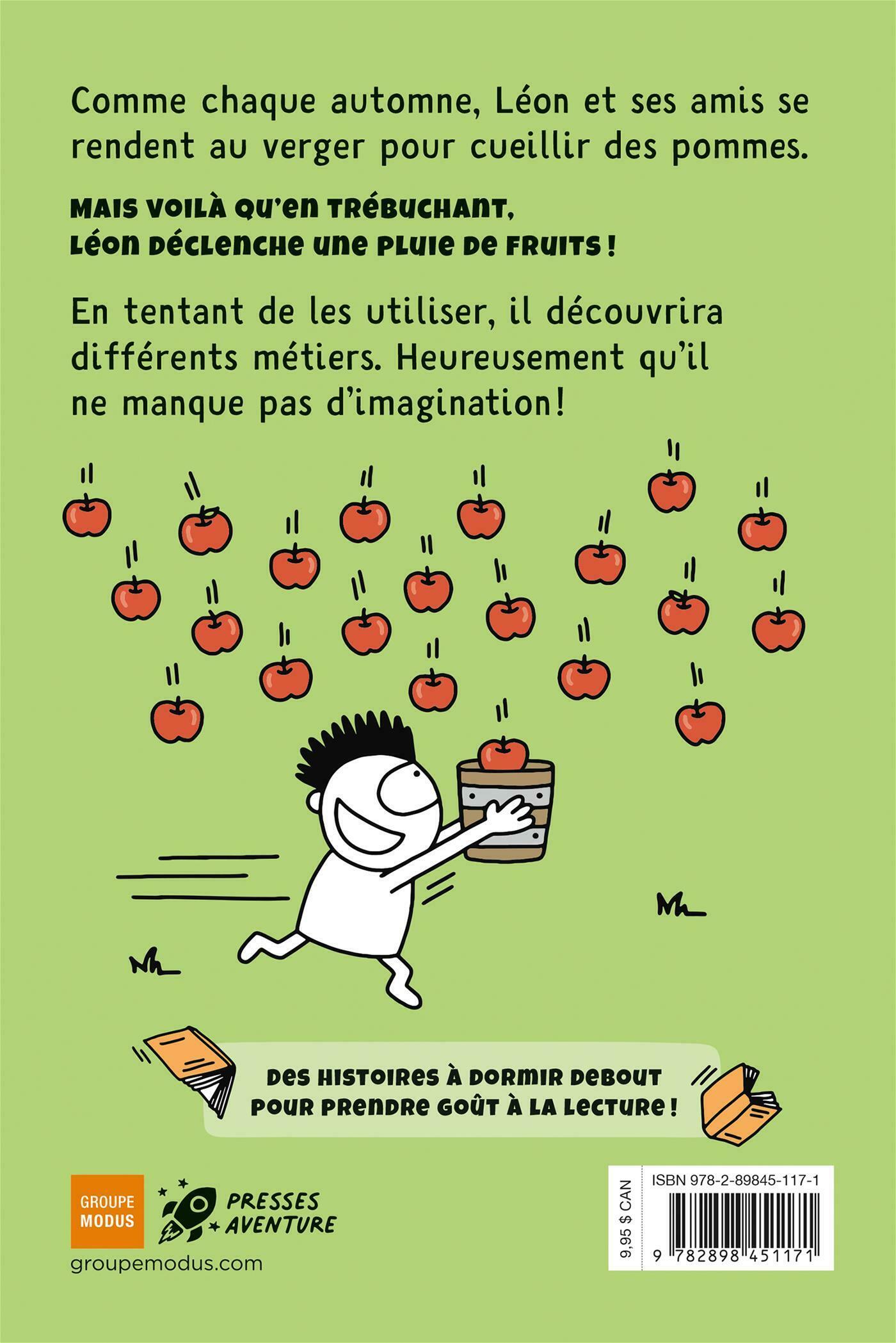 Comme chaque automne, Léon et ses amis se rendent au verger pour cueillir des pommes. Mais voilà qu'en trébuchant, Léon déclenche une pluie de fruits! En tentant de les utiliser, il découvrira différents métiers. Heureusement qu'il ne manque pas d'imagination!