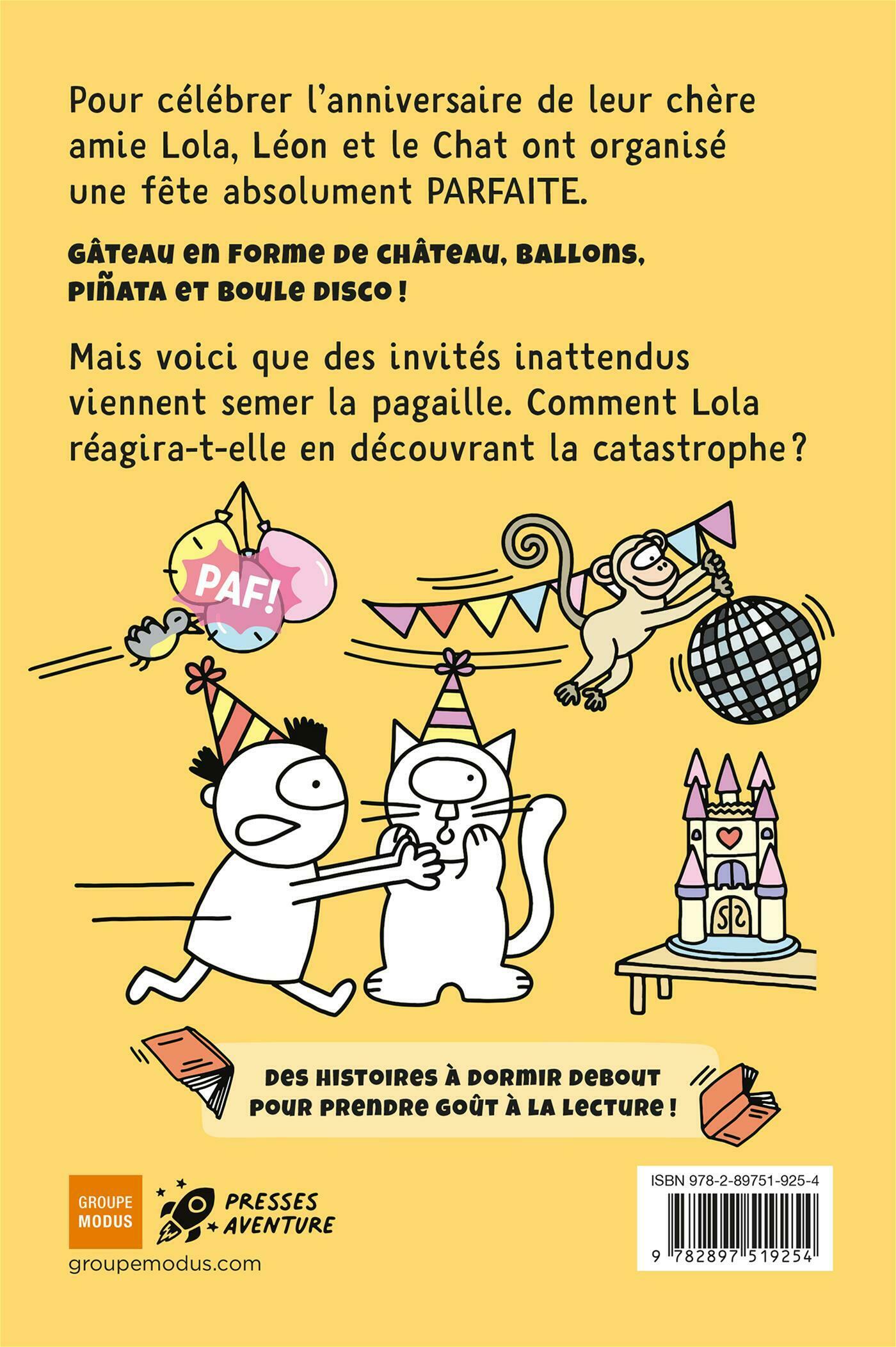 L'auteure et créatrice de Léon, Annie Groovie, propose une nouvelle première lecture pour initier les plus jeunes à l'univers de Léon et à la lecture.Pour célébrer l'anniversaire de leur chère amie Lola, Léon et le Chat ont organisé une fête absolument PARFAITE.Gâteau en forme de château, ballons, piñata et boule disco!Mais voici que des invités inattendus viennent semer la pagaille. Comment Lola réagira-t-elle en découvrant la catastrophe?