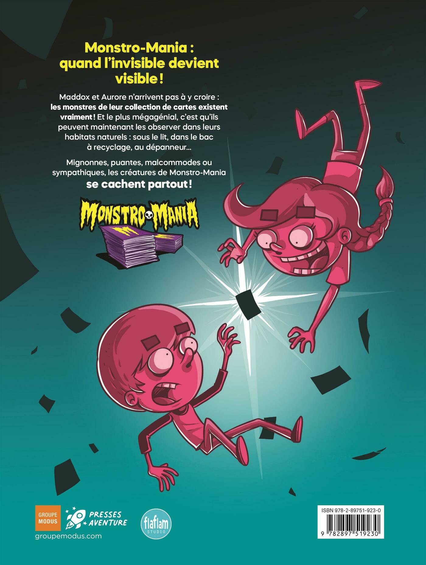 Monstro-Mania: quand l'invisible devient visible!Maddox et Aurore n'arrivent pas à y croire: les monstres de leur collection de cartes existent vraiment! Et le plus mégagénial, c'est qu'ils peuvent maintenant les observer dans leurs habitats naturels: sous le lit, dans le bac à recyclage, au dépanneur...Mignonnes, puantes, malcommodes ou sympathiques, les créatures de Monstro-Mania se cachent partout!