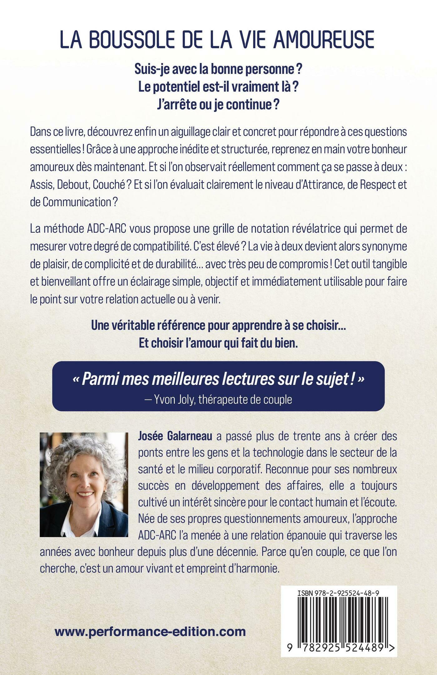 LA BOUSSOLE DE LA VIE AMOUREUSE. Suis-je avec la bonne personne ? Le potentiel est-il vraiment là ? J’arrête ou je continue ? Dans ce livre, découvrez enfin un aiguillage clair et concret pour répondre à ces questions essentielles! Grâce à une approche inédite et structurée, reprenez en main votre bonheur amoureux dès maintenant. Et si l’on observait réellement comment ça se passe à deux : Assis, Debout, Couché? Et si l’on évaluait clairement le niveau d’Attirance, de Respect et de Communication? La méthode ADC-ARC vous propose une grille de notation révélatrice qui permet de mesurer votre degré de compatibilité. C’est élevé? La vie à deux devient alors synonyme de plaisir, de complicité et de durabilité… avec très peu de compromis! Cet outil tangible et bienveillant offre un éclairage simple, objectif et immédiatement utilisable pour faire le point sur votre relation actuelle ou à venir.