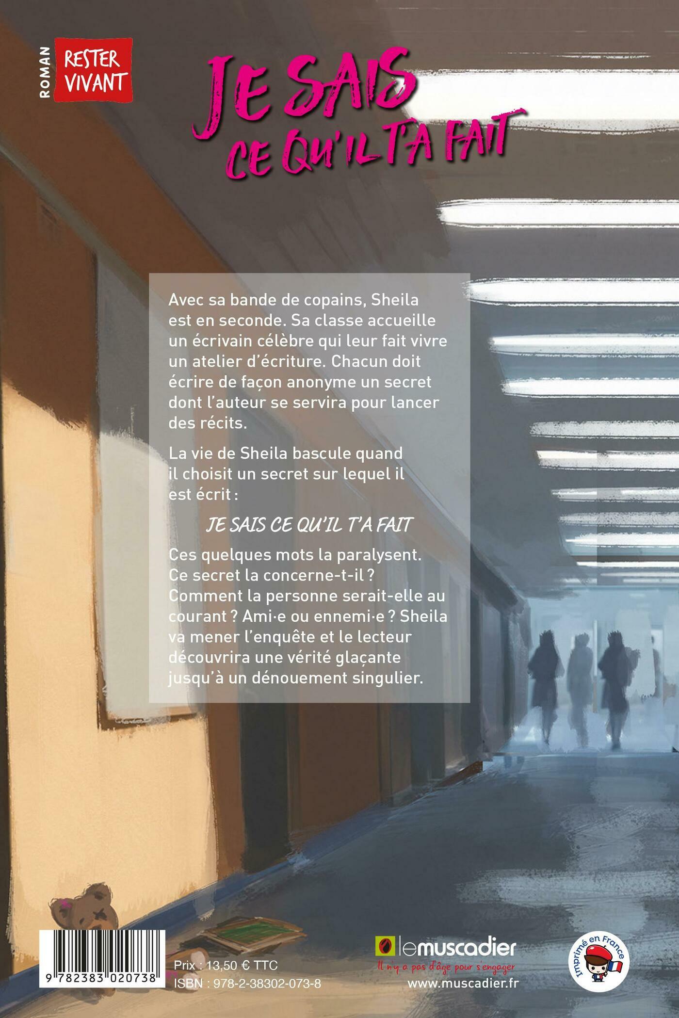 Avec sa bande de copains, Sheila est en seconde. Sa classe accueille un écrivain célèbre qui leur fait vivre un atelier d’écriture. Chacun doit écrire de façon anonyme un secret dont l’auteur se servira pour lancer des récits. La vie de Sheila bascule quand il choisit un secret sur lequel il est écrit : « JE SAIS CE QU’IL T’A FAIT » Ces quelques mots la paralysent. Ce secret la concerne-t-il ? Comment la personne serait-elle au courant ? Ami·e ou ennemi·e ? Sheila va mener l’enquête et le lecteur découvrira une vérité glaçante jusqu’à un dénouement singulier.