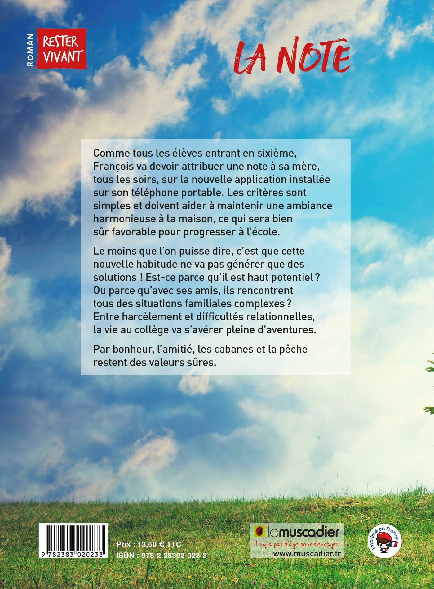 Comme tous les élèves entrant en sixième, François va devoir attribuer une note à sa mère, tous les soirs, sur la nouvelle application installée sur son téléphone portable. Les critères sont simples et doivent aider à maintenir une ambiance harmonieuse à la maison, ce qui sera bien sûr favorable pour progresser à l’école. Le moins que l’on puisse dire, c’est que cette nouvelle habitude ne va pas générer que des solutions ! Est-ce parce qu’il est haut potentiel ? Ou parce qu’avec ses amis, ils rencontrent tous des situations familiales complexes ? Entre harcèlement et difficultés relationnelles, la vie au collège va s’avérer pleine d’aventures. Par bonheur, l’amitié, les cabanes et la pêche restent des valeurs sûres.