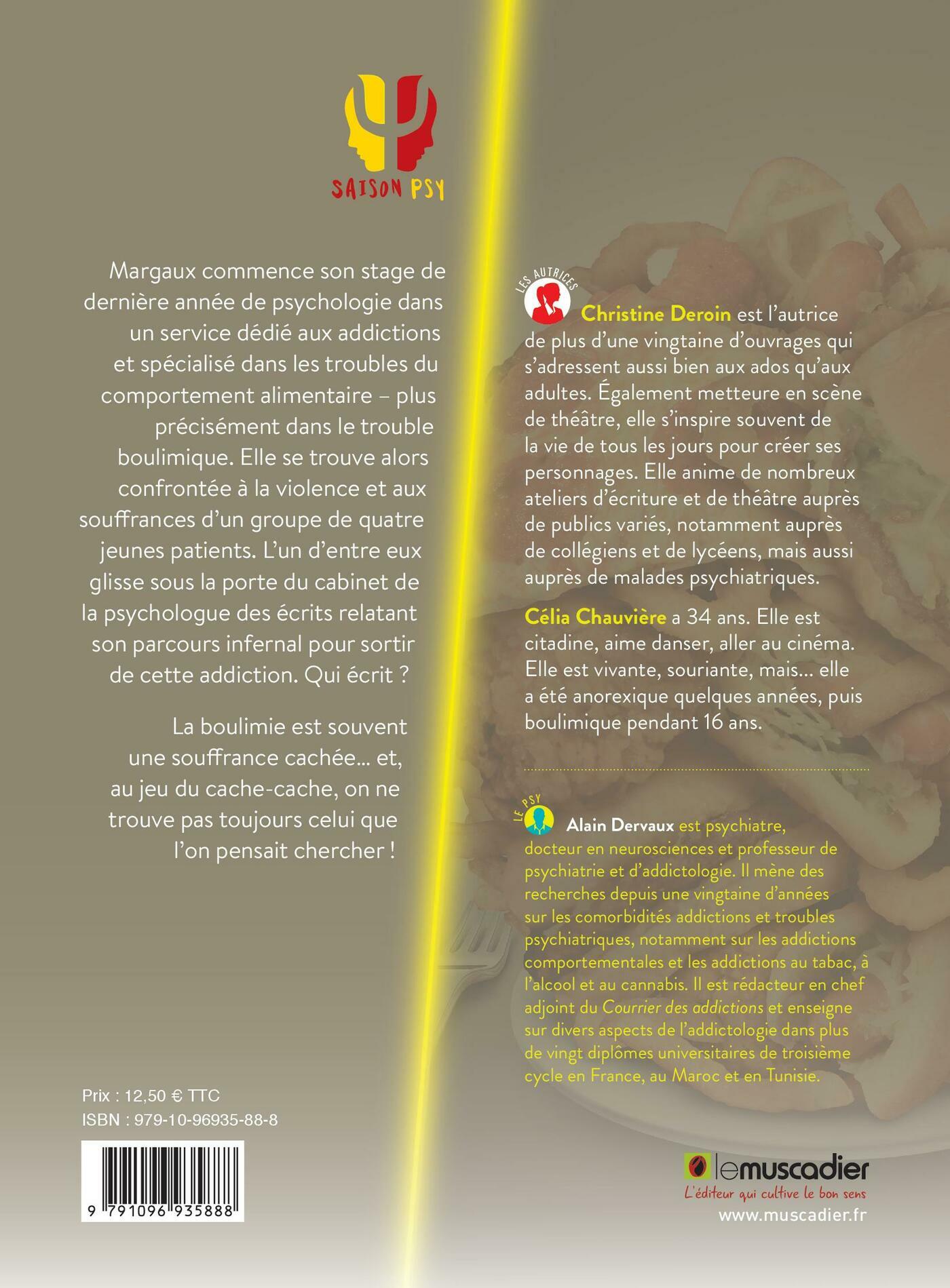 Margaux commence son stage de dernière année de psychologie dans un service dédié aux addictions et spécialisé dans les troubles du comportement alimentaire – plus précisément dans le trouble boulimique. Elle se trouve alors confrontée à la violence et aux souffrances d’un groupe de quatre jeunes patients. L’un d’entre eux glisse sous la porte du cabinet de la psychologue des écrits relatant son parcours infernal pour sortir de cette addiction. Qui écrit ? La boulimie est souvent une souffrance cachée… et, au jeu du cache-cache, on ne trouve pas toujours celui que l’on pensait chercher !