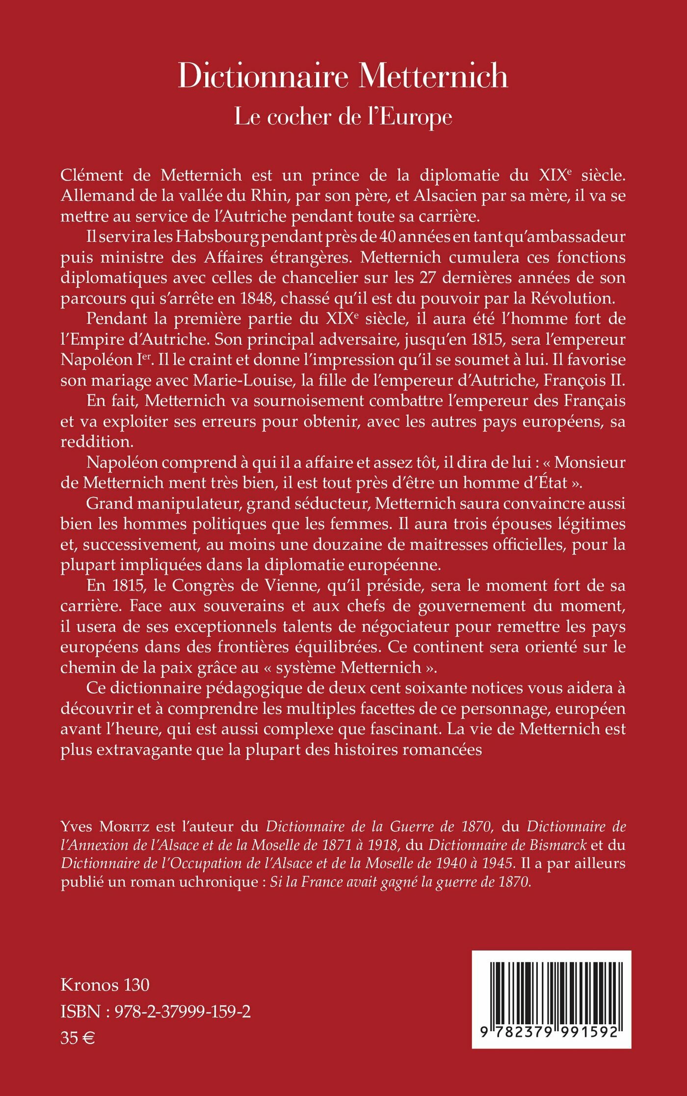 Ce dictionnaire pédagogique de deux cent soixante notices vous aidera à découvrir et à comprendre les multiples facettes de ce personnage, européen avant l’heure, qui est aussi complexe que fascinant. La vie de Metternich est plus extravagante que la plupart des histoires romancées