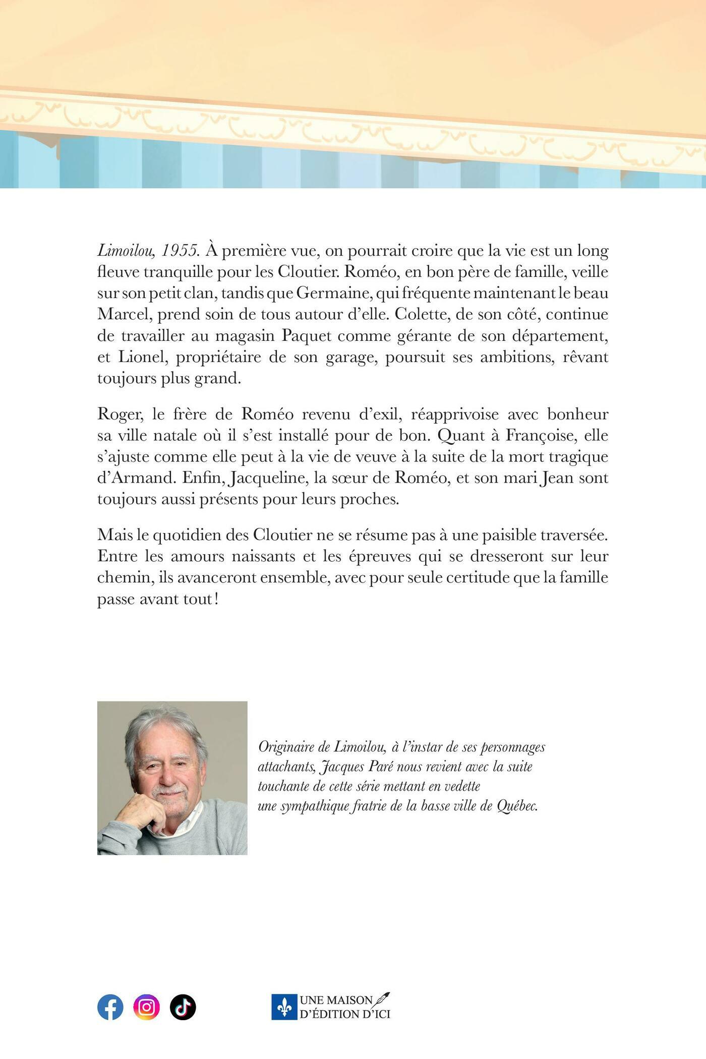 Limoilou, 1955.À première vue, on pourrait croire que la vie est un longfleuve tranquille pour les Cloutier. Roméo, en bon père de famille, veillesur son petit clan, tandis que Germaine, qui fréquente maintenant le beauMarcel, prend soin de tous autour d’elle. Colette, de son côté, continuede travailler au magasin Paquet comme gérante de son département,et Lionel, propriétaire de son garage, poursuit ses ambitions, rêvanttoujours plus grand.Roger, le frère de Roméo revenu d’exil, réapprivoise avec bonheursa ville natale où il s’est installé pour de bon. Quant à Françoise, elles’ajuste comme elle peut à la vie de veuve à la suite de la mort tragiqued’Armand. Enfin, Jacqueline, la sœur de Roméo, et son mari Jean sonttoujours aussi présents pour leurs proches.Mais le quotidien des Cloutier ne se résume pas à une paisible traversée.Entre les amours naissants et les épreuves qui se dresseront sur leurchemin, ils avanceront ensemble, avec pour seule certitude que la famillepasse avant tout !