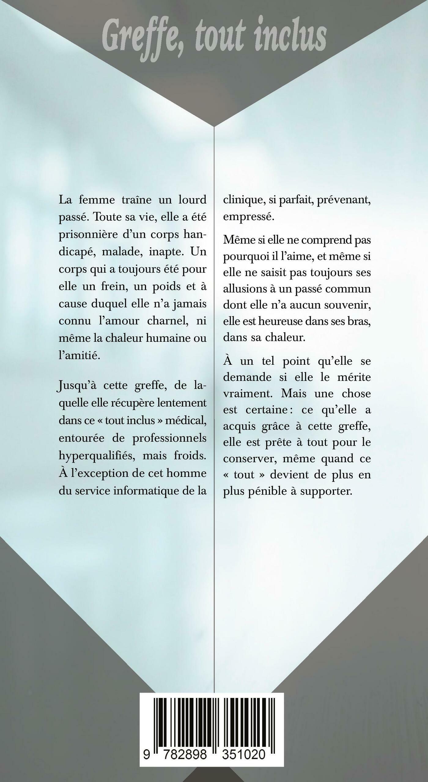 La femme traîne un lourd passé. Toute sa vie, elle a été prisonnière d’un corps handicapé, malade, inapte. Un corps qui a toujours été pour elle un frein, un poids et à cause duquel elle n’a jamais connu l’amour charnel, ni même la chaleur humaine ou l’amitié.Jusqu’à cette greffe, de laquelle elle récupère lentement dans ce « tout inclus » médical, entourée de professionnels hyperqualifiés, mais froids. À l’exception de cet homme du service informatique de la clinique, si parfait, prévenant, empressé.Même si elle ne comprend pas pourquoi il l’aime, et même si elle ne saisit pas toujours ses allusions à un passé commun dont elle n’a aucun souvenir, elle est heureuse dans ses bras, dans sa chaleur.À un tel point qu’elle se demande si elle le mérite vraiment. Mais une chose est certaine : ce qu’elle a acquis grâce à cette greffe, elle est prête à tout pour le conserver, même quand ce « tout » devient de plus en plus pénible à supporter.