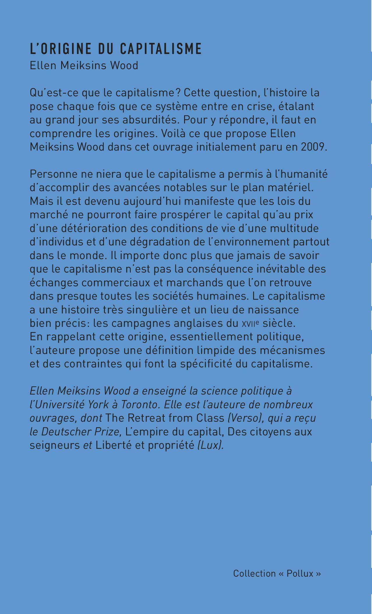 Qu’est-ce que le capitalisme? Cette question, l’histoire la pose chaque fois que ce système entre en crise, étalantau grand jour ses absurdités. Pour y répondre, il faut en comprendre les origines. Voilà ce que propose Ellen Meiksins Wood dans cet ouvrage initialement paru en 2009.Personne ne niera que le capitalisme a permis à l’humanité d’accomplir des avancées notables sur le plan matériel. Mais il est devenu aujourd’hui manifeste que les lois du marché ne pourront faire prospérer le capital qu’au prix d’une détérioration des conditions de vie d’une multitude d’individus et d’une dégradation de l’environnement partout dans le monde. Il importe donc plus que jamais de savoir que le capitalisme n’est pas la conséquence inévitable des échanges commerciaux et marchands que l’on retrouve dans presque toutes les sociétés humaines. Le capitalisme a une histoire très singulière et un lieu de naissance bien précis: les campagnes anglaises du XVIIe siècle. En rappelant cette origine, essentiellement politique, l’auteure propose une définition limpide des mécanismes et des contraintes qui font la spécificité du capitalisme.
