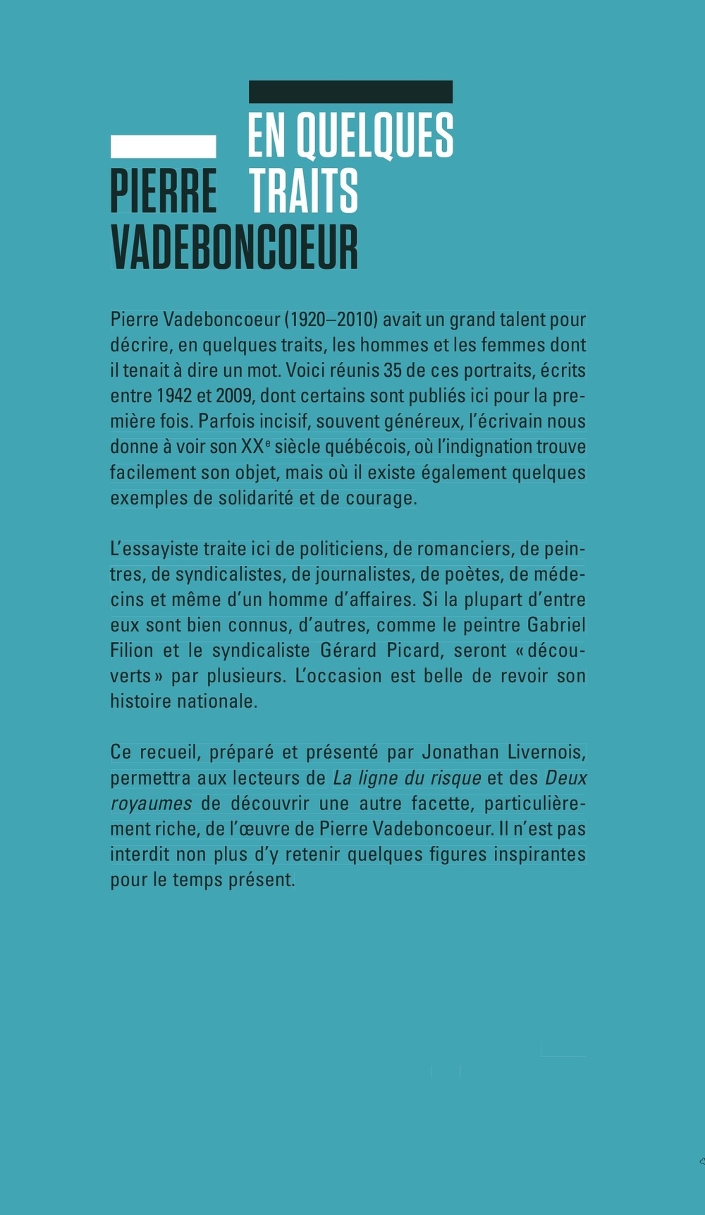 Mathieu Bélisle, Julie Mazzieri, Isabelle Daunais, Jonathan Livernois, Mauricio Segura, Daniel D. Jacques, Yvon Rivard, Pierre Vadeboncoeur, Thomas O. St-Pierre, Patrice Reytier, Marie-Anne Letarte, Vincent Lambert, Robert Levesque, Michel Biron, David Dorais, Marie-Andrée Lamontagne, Georges Privet, Sylvain David, Stanley Péan, Patrick Nicol