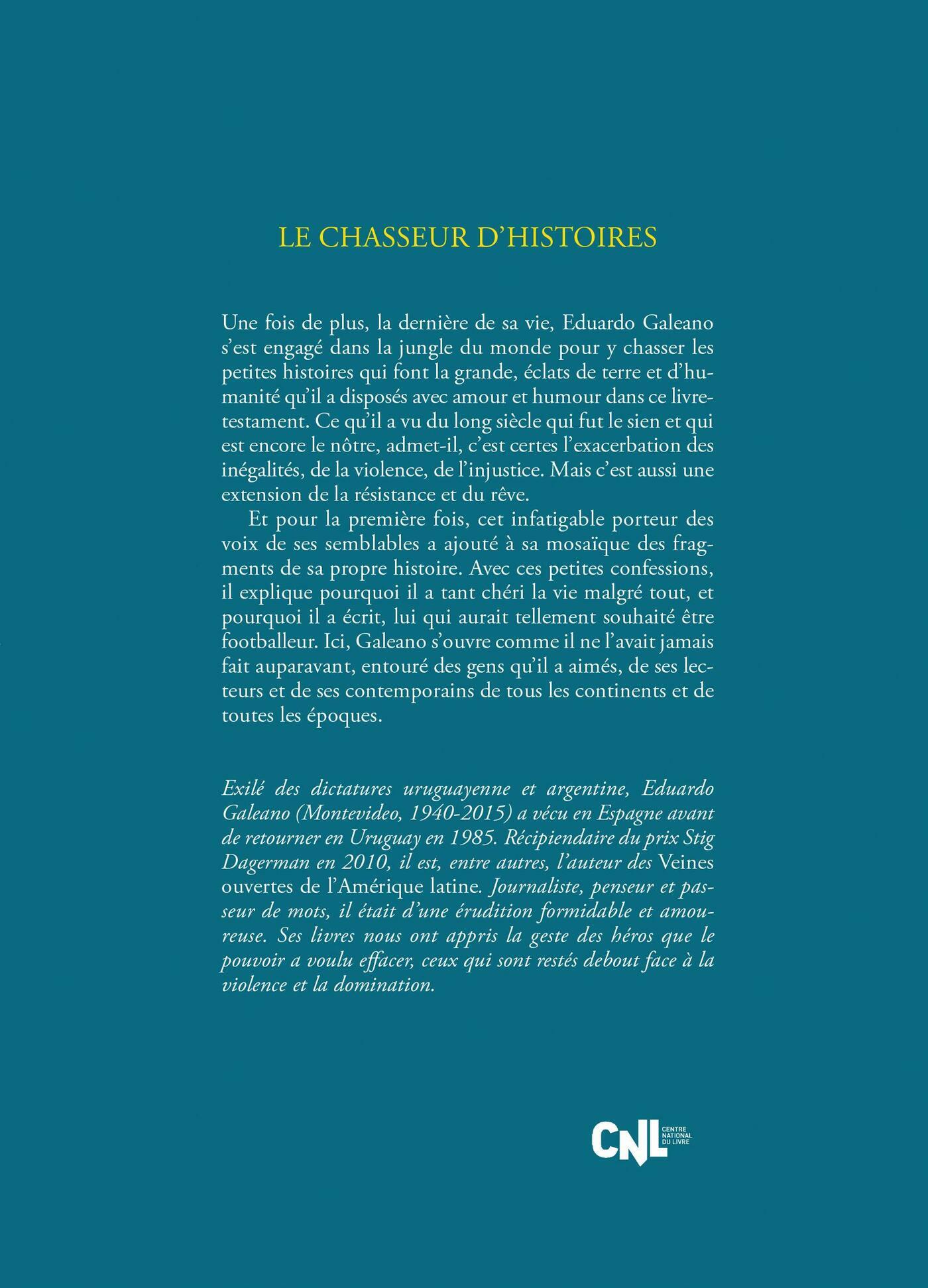 Une fois de plus, la dernière de sa vie, Eduardo Galeano s’est engagé dans la jungle du monde pour y chasser les petites histoires qui font la grande, éclats de terre et d’humanité qu’il a disposés avec amour et humour dans ce livre-testament. Ce qu’il a vu du long siècle qui fut le sien et qui est encore le nôtre, admet-il, c’est certes l’exacerbation des inégalités, de la violence, de l’injustice. Mais c’est aussi une extension de la résistance et du rêve.Et pour la première fois, cet infatigable porteur des voix de ses semblables a ajouté à sa mosaïque des fragments de sa propre histoire. Avec ces petites confessions, il explique pourquoi il a tant chéri la vie malgré tout, et pourquoi il a écrit, lui qui aurait tellement souhaité être footballeur. Ici, Galeano s’ouvre comme il ne l’avait jamais fait auparavant, entouré des gens qu’il a aimés, de ses lecteurs et de ses contemporains de tous les continents et de toutes les époques.