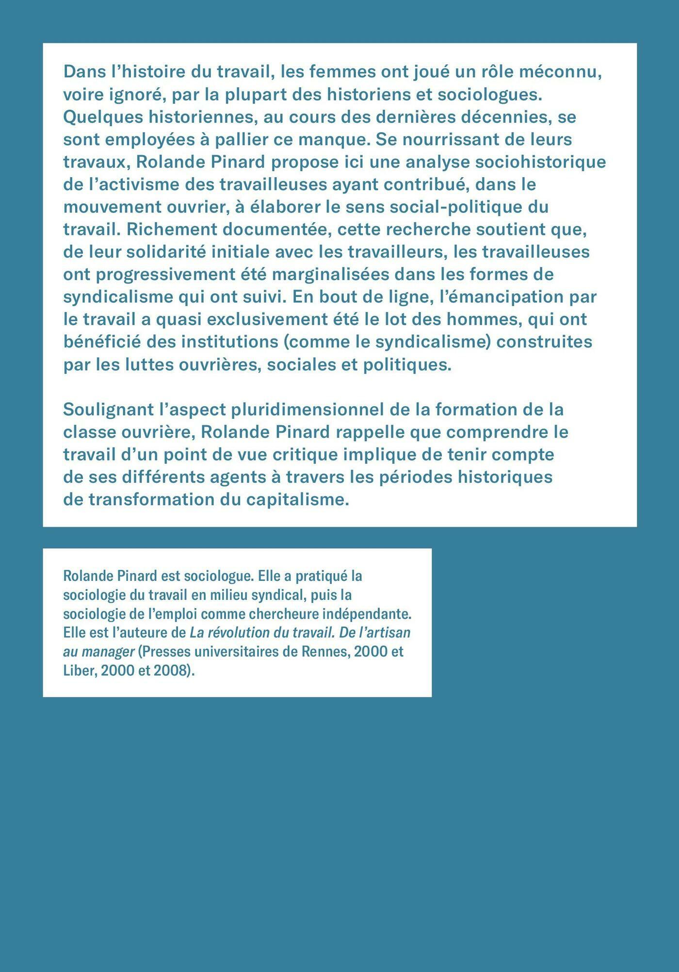 Dans l’histoire du travail, les femmes ont joué un rôle méconnu, voire ignoré, par la plupart des historiens et sociologues. Quelques historiennes, au cours des dernières décennies se sont employées à pallier ce manque. Se nourrissant de leurs travaux, Rolande Pinard propose ici une analyse sociohistorique de l’activisme des travailleuses ayant contribué, dans le mouvement ouvrier, à élaborer le sens social-politique du travail. Richement documentée, cette recherche soutient que, de leur solidarité initiale avec les travailleurs, les travailleuses ont progressivement été marginalisées dans les formes de syndicalisme qui ont suivi. En bout de ligne, l’émancipation par le travail a quasi exclusivement été le lot des hommes, qui ont bénéficié des institutions (comme le syndicalisme) construites par les luttes ouvrières, sociales et politiques des salarié.e.s.Soulignant l’aspect pluridimensionnel de la formation de la classe ouvrière, Rolande Pinard rappelle que comprendre le travail d’un point de vue critique implique de tenir compte de ses différents agents à travers les périodes historiques de transformation du capitalisme.