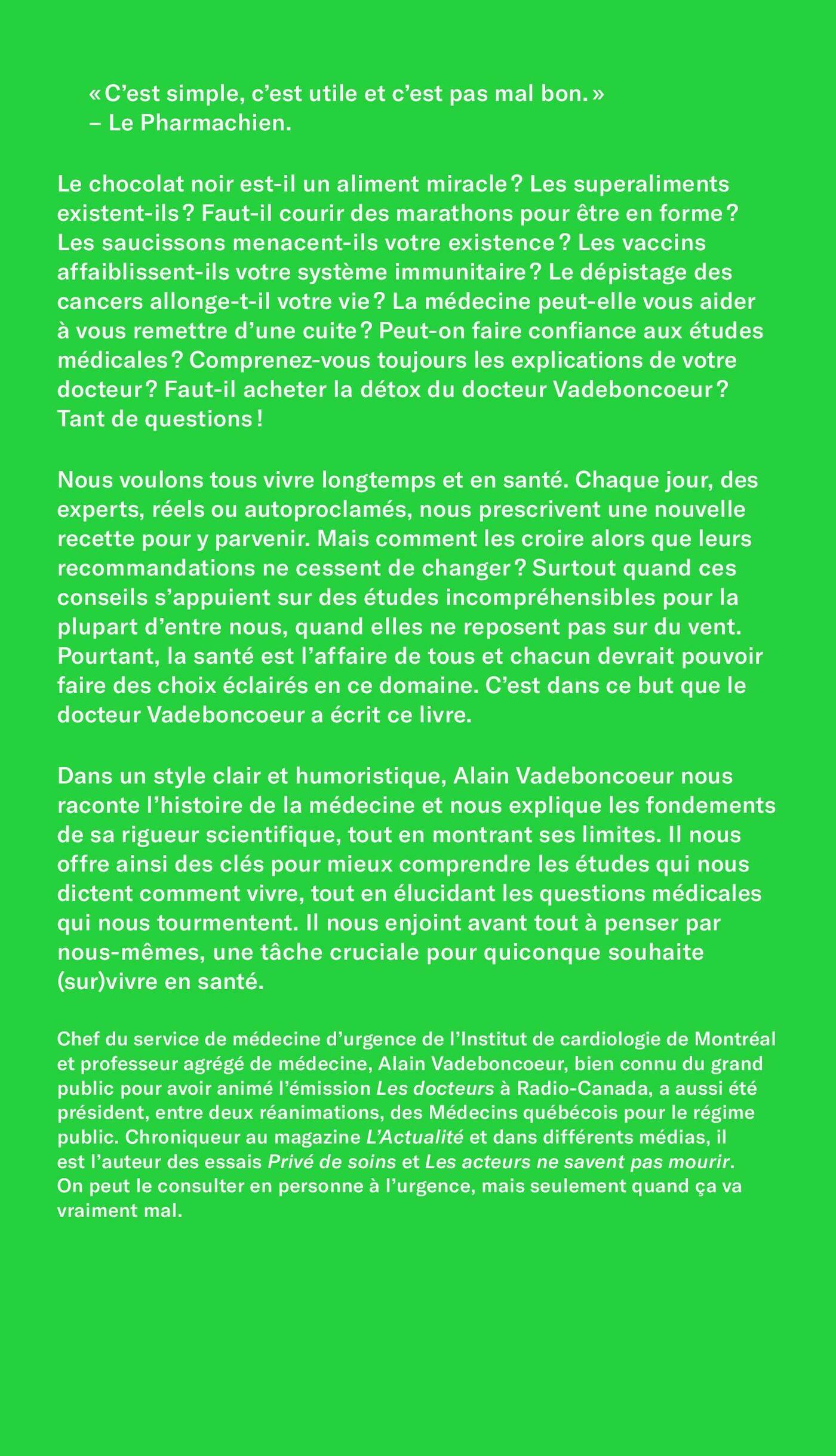 Le chocolat noir est-il un aliment miracle ? Les superaliments existent-ils ? Faut-il courir des marathons pour être en forme ? Les saucissons menacent-ils votre existence ? Les vaccins affaiblissent-ils votre système immunitaire ? Le dépistage des cancers allonge-t-il votre vie ? La médecine peut-elle vous aider à vous remettre d’une cuite ? Peut-on faire confiance aux études médicales ? Comprenez-vous toujours les explications de votre docteur ? Faut-il acheter la détox du docteur Vadeboncoeur ? Tant de questions ! Nous voulons tous vivre longtemps et en santé. Chaque jour, des experts, réels ou autoproclamés, nous prescrivent une nouvelle recette pour y parvenir. Mais comment les croire alors que leurs recommandations ne cessent de changer ? Surtout quand ces conseils s’appuient sur des études incompréhensibles pour la plupart d’entre nous, quand elles ne reposent pas sur du vent. Pourtant, la santé est l’affaire de tous et chacun devrait pouvoir faire des choix éclairés en ce domaine. C’est dans ce but que le docteur Vadeboncoeur a écrit ce livre.Dans un style clair et humoristique, Alain Vadeboncoeur nous raconte l’histoire de la médecine et nous explique les fondements de sa rigueur scientifique, tout en montrant ses limites. Il nous offre ainsi des clés pour mieux comprendre les études qui nous dictent comment vivre, tout en élucidant les questions médicales qui nous tourmentent. Il nous enjoint avant tout à penser par soi-même, une tâche cruciale pour quiconque souhaite (sur)vivre en santé.